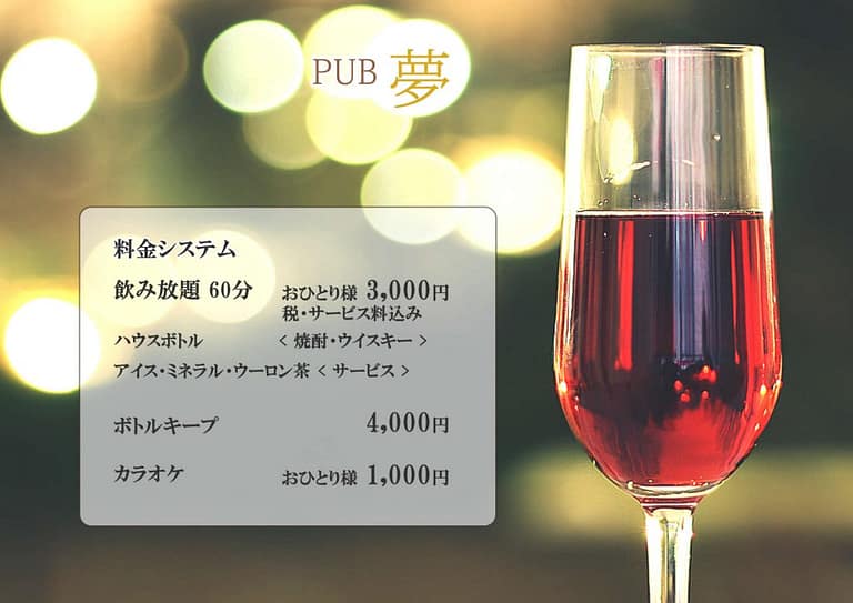 おつまみセット・カラオケ、ウイスキー料金、焼酎料金、ビール・ワイン・シャンパン、お料理