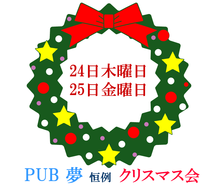 12月24日と25日、パブ夢のクリスマス会を開催致します。 昨年ご来店頂いたお客様~、今年始めてのお客様も大歓迎です(* […]