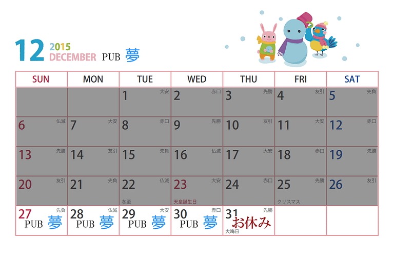 27日は日曜日ですが、PUB夢は元気に営業していま~す(*^^*) クリスマスの余韻を感じながら飲むのもいいし、静かに乾 […]