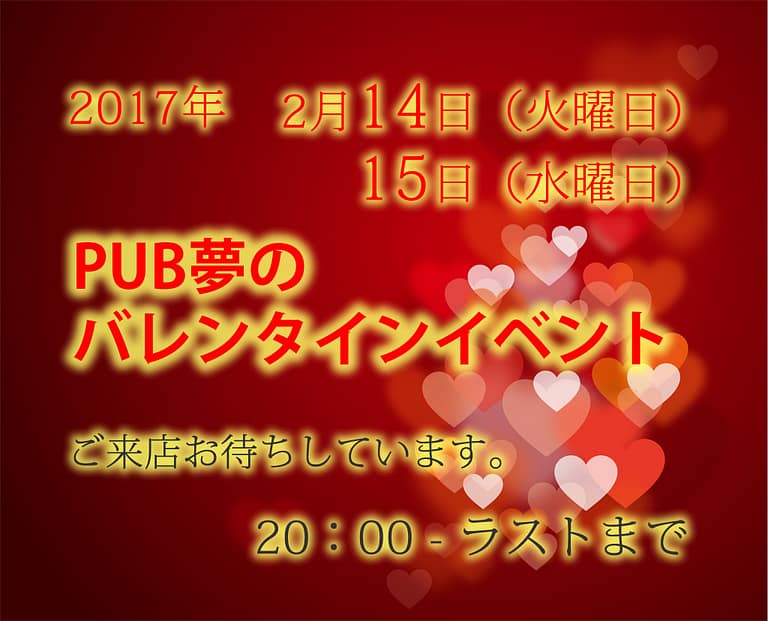 記念日 2017年2月12日 2017年 PUB夢バレンタイン 2017年PUB夢 バレンタインイベント うれし恥ずかし バレンタイン(*˘︶˘*).。.:*♡ キャンドルを灯し、ちょ […] 続きを読む
