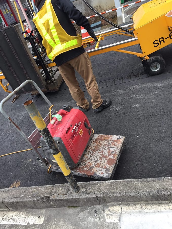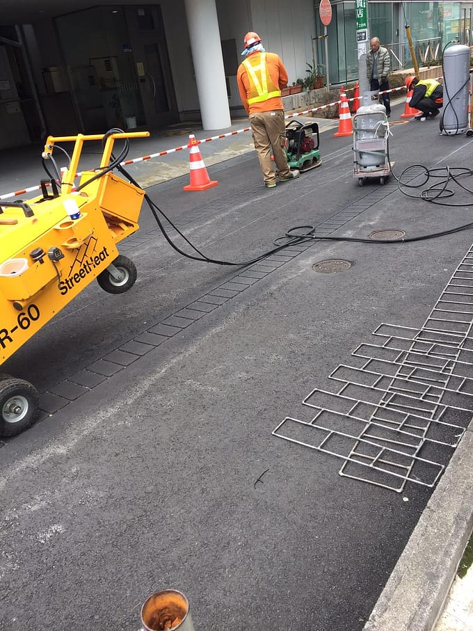 道路真ん中のカクカクしたあの柄は、手前にある金網を置いて、バンバン押して作られていたんですね。
