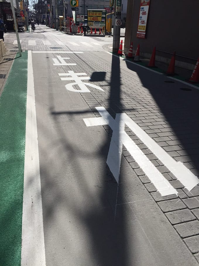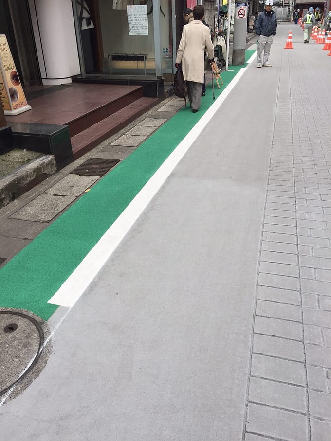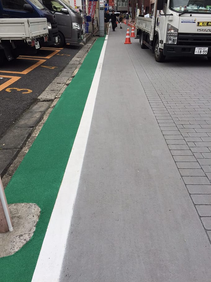 歩道は緑、車道はグレー。色分けすることで安心して歩ける気がします。