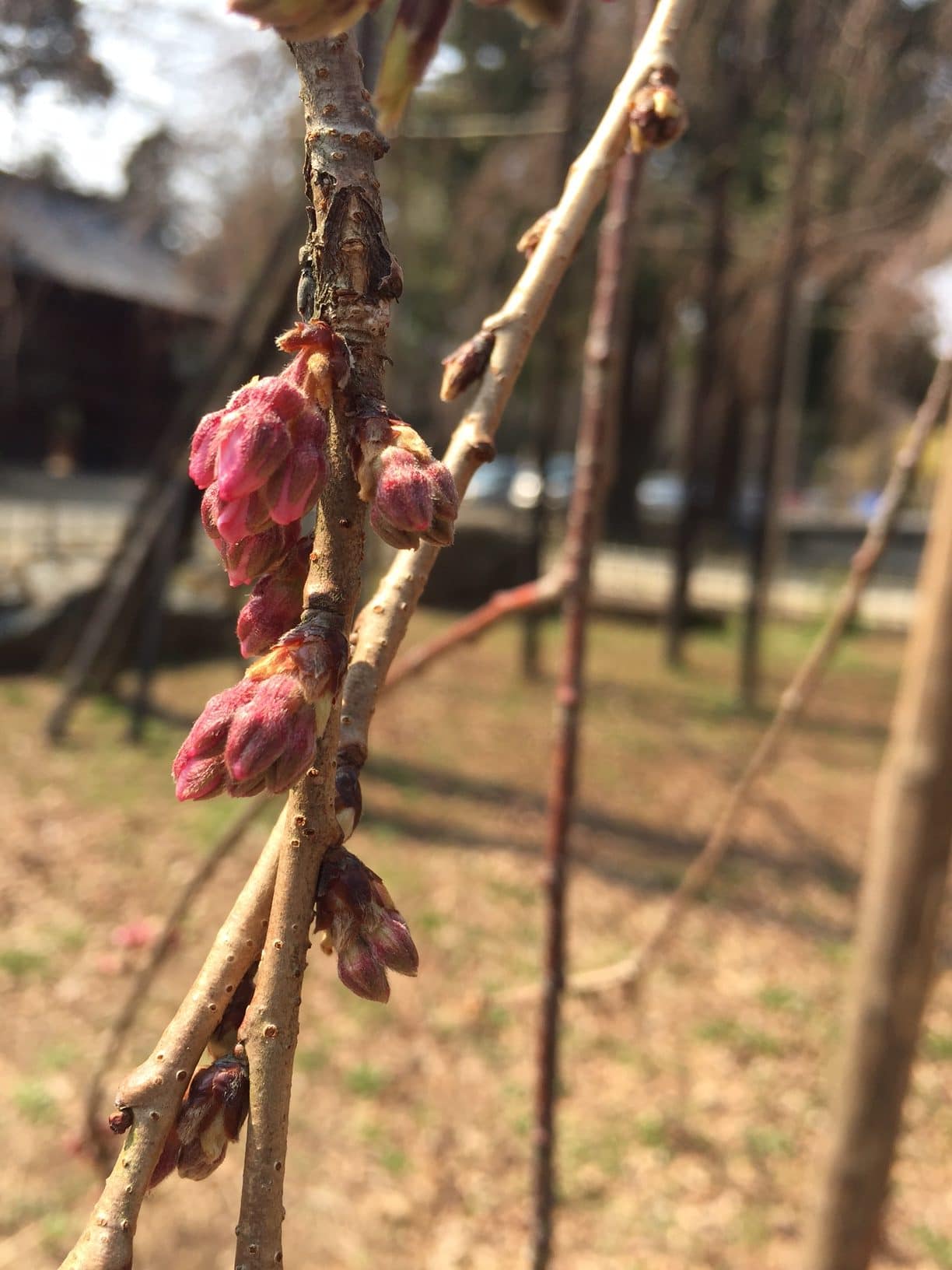しだれた枝につぼみが色づいています