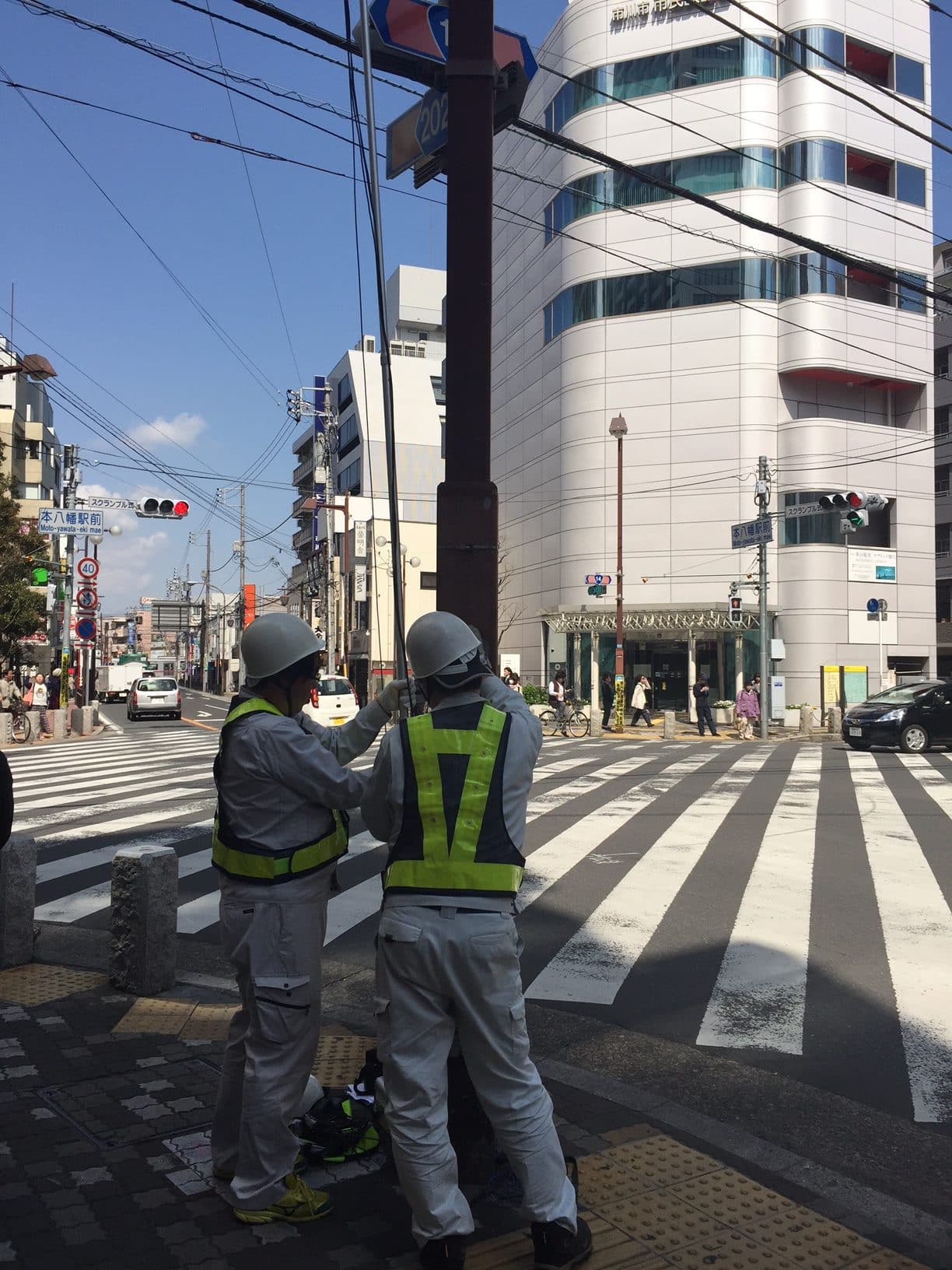 本八幡北口の交差点、ポールを持って何かしています。