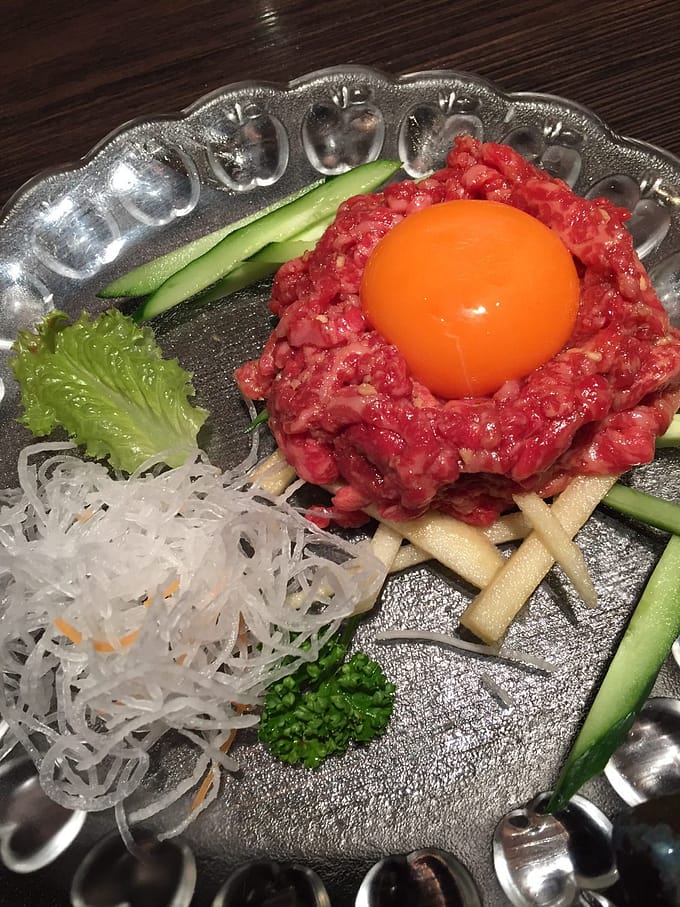 味楽亭に来たら必ず注文するユッケ。新鮮で美味しいユッケは色を見ればわかります。お肉の味は生で味わうのが最高ですねー