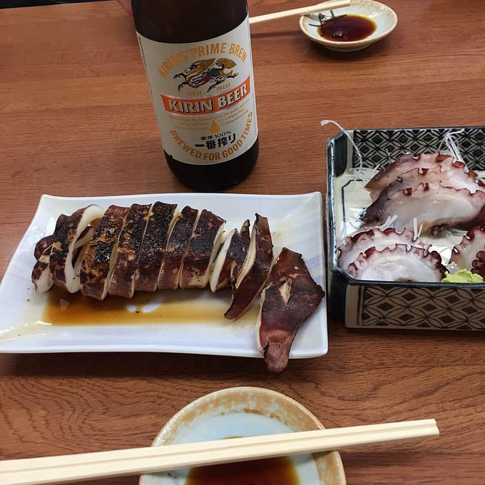 遅いランチの前にビールです。イカの姿焼きは、そのままお醤油をかけていただきました。地元で釣れたタコだと思います。これがまた美味しいのよ。