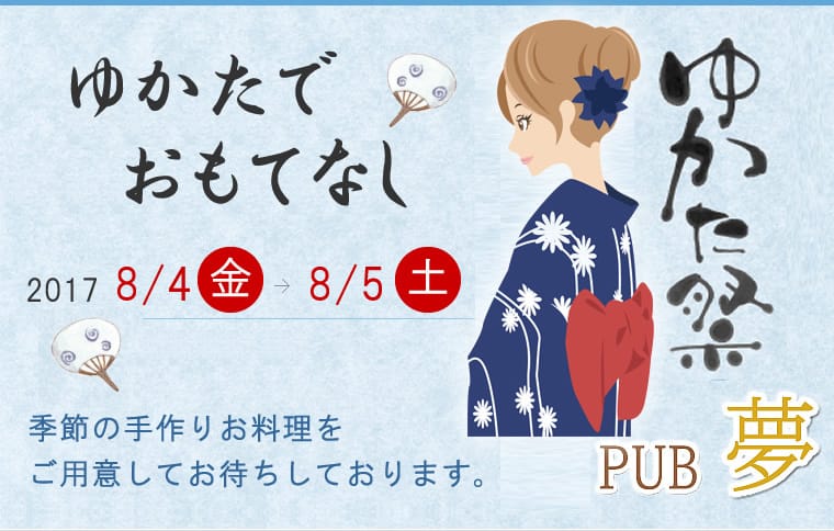 PUB夢は8月4日金曜日、5日の土曜日、スタッフがゆかたを着てお迎えするイベント、ゆかた祭りをします。
