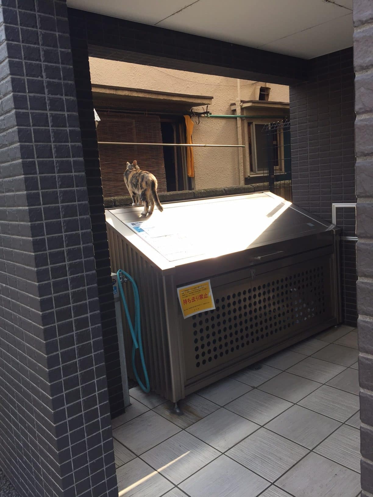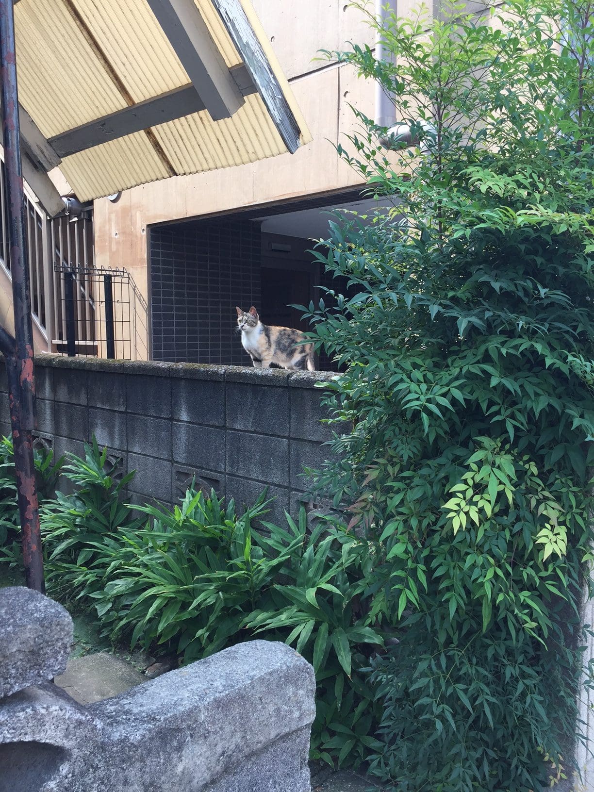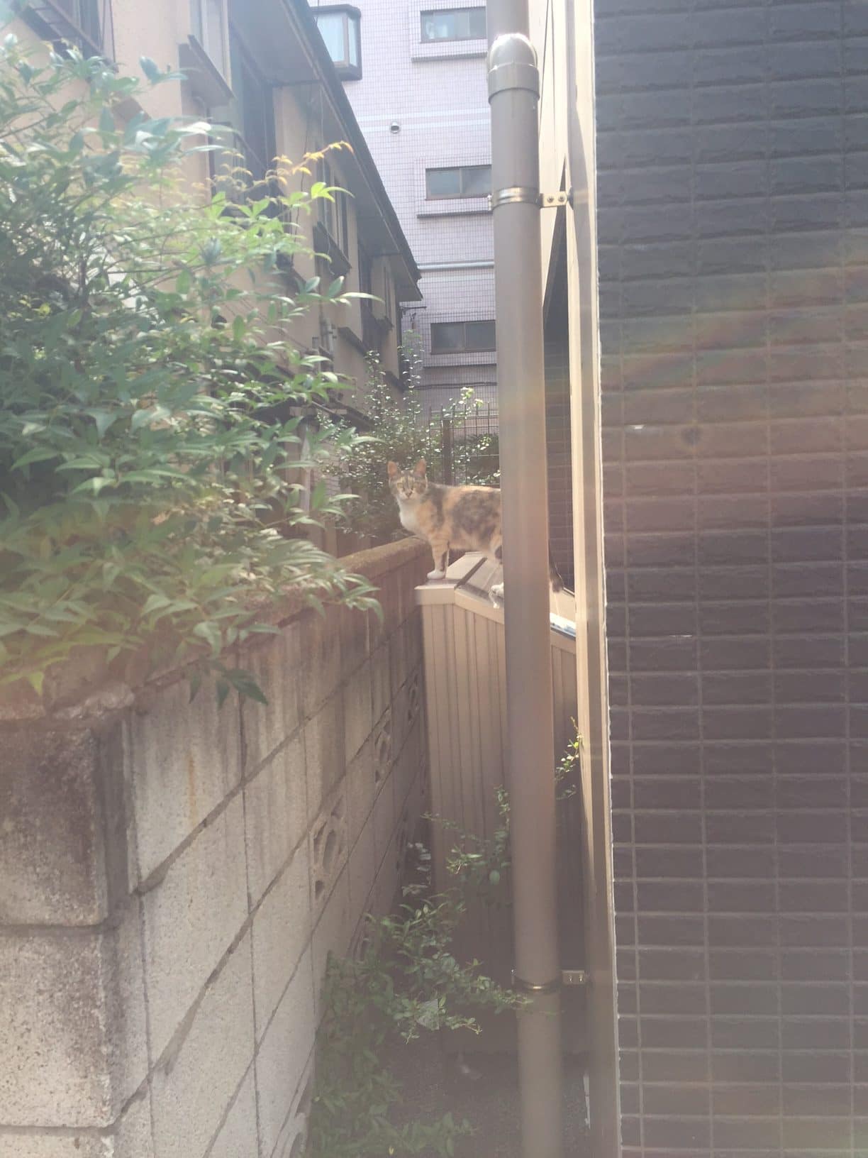 昔ながらの塀、アパートの階段の屋根、葉っぱの緑色もきれい。猫ちゃんがいる風景っていいよねー