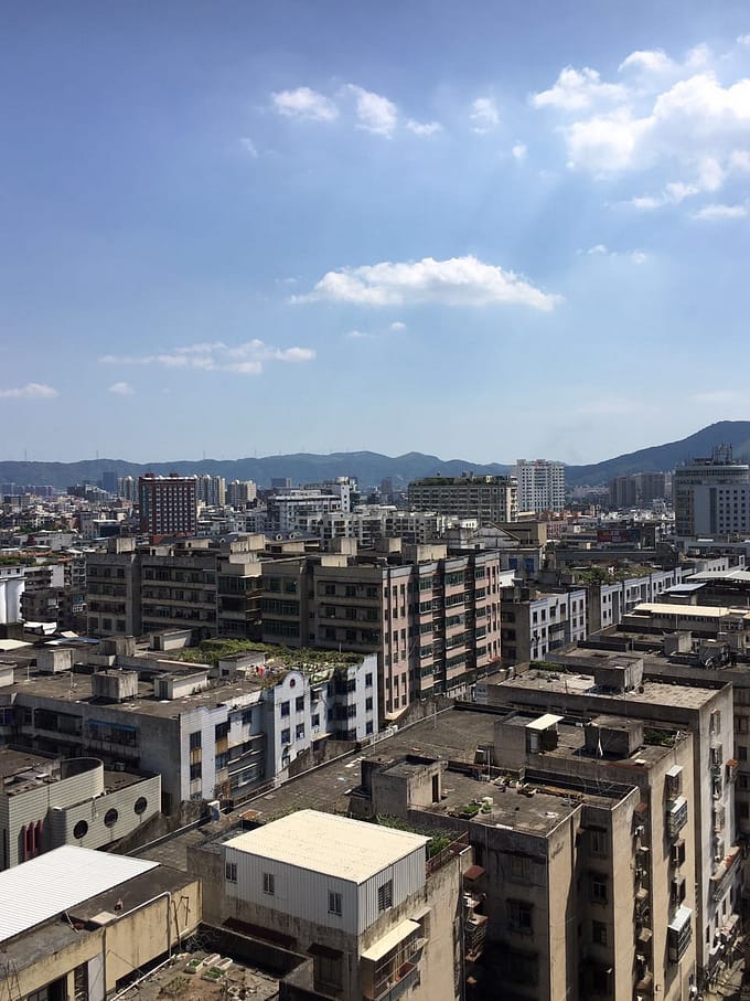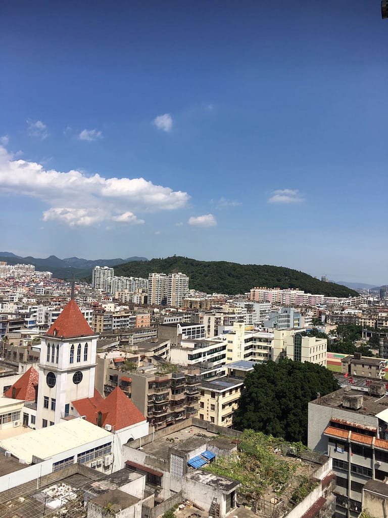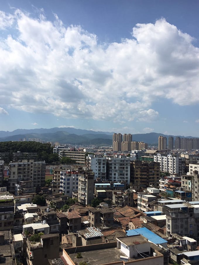 わたしのお家は福清市(ふくせいし)にあります。部屋の窓から見える景色。素晴らしい見晴らしでしょ?