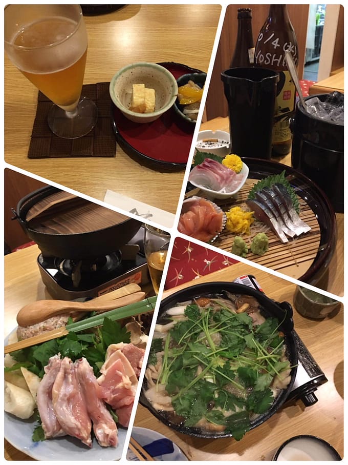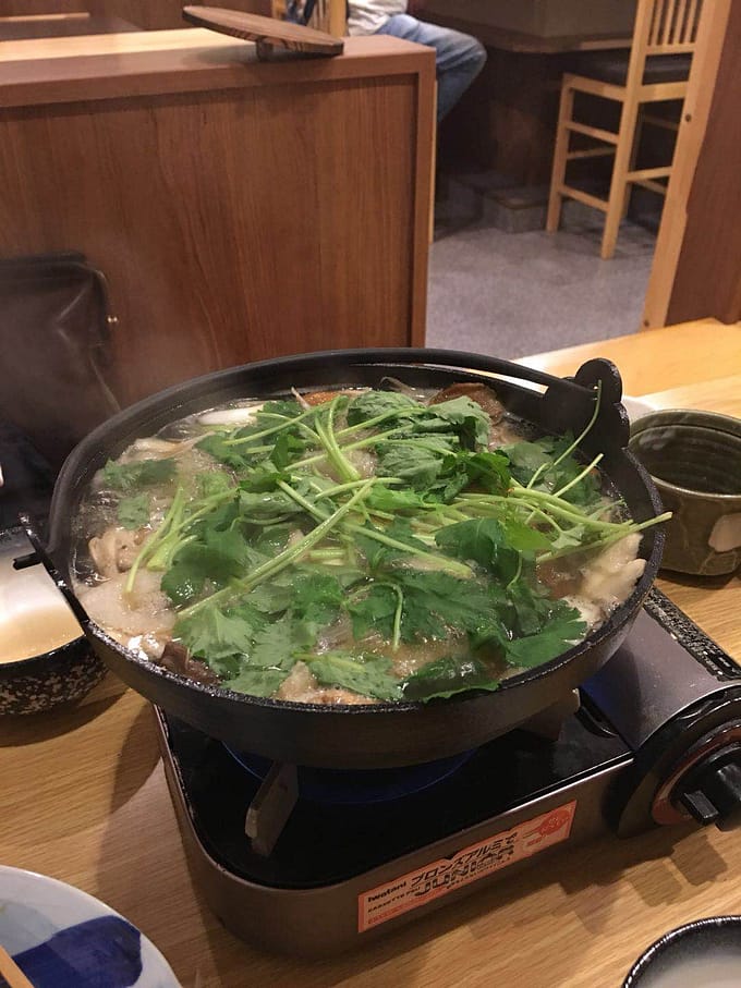秋田の郷土料理、きりたんぽん鍋をいただきました。鶏ガラだしの鍋、鶏は手羽肉、三つ葉をいっぱい乗せていただきます。