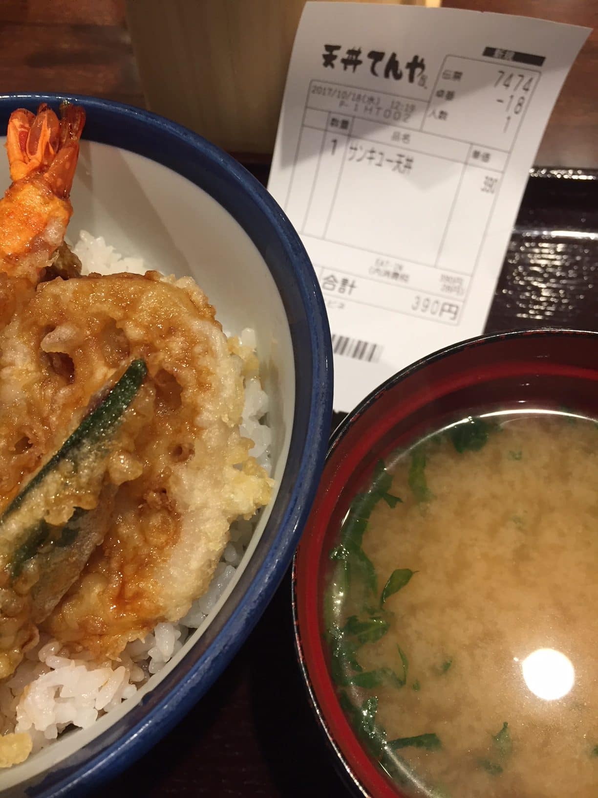 ん~、これ目当てに行列ができていたのね。その日は「てんやの日」天丼が390円。10と8で「てんやの日」なんですね。10分並んだかいがありました。わたしもサンキュー天丼を注文しました。