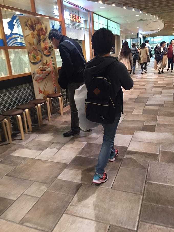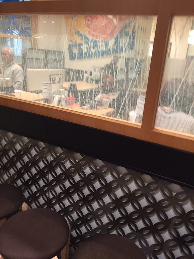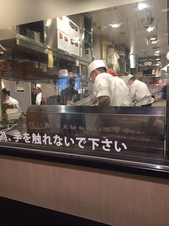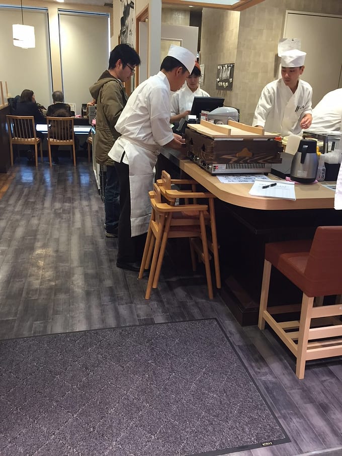 にぎっているのか?それとも、お魚をさばいているのかしら?板前さんたちの真剣な表情と、白衣がとってもステキでした。