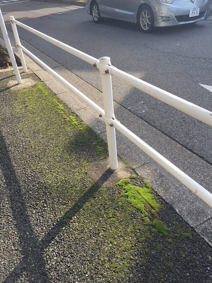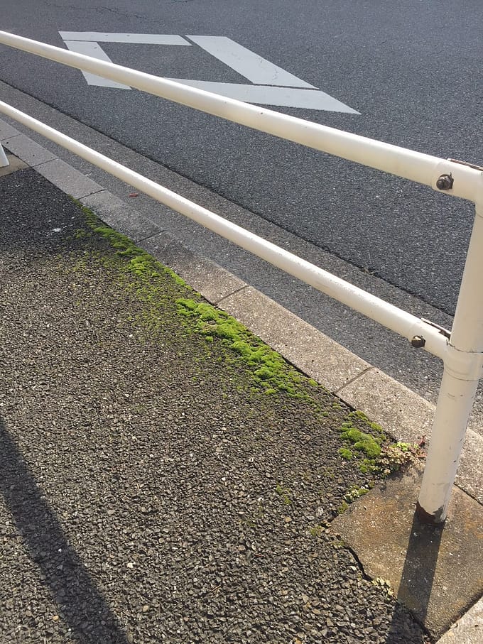 コンクリートの歩道に、あざやかな緑。これは歩道に生えたコケです。