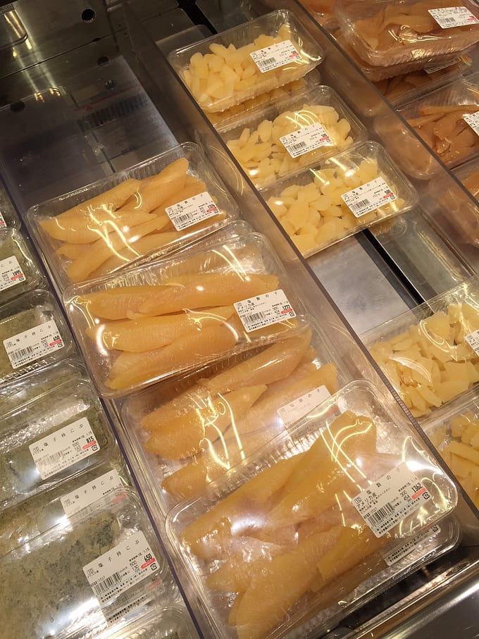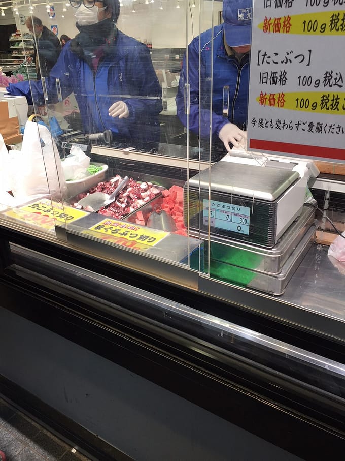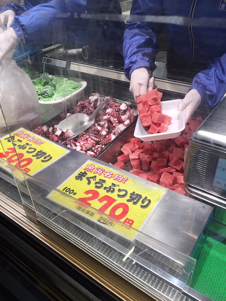 魚寅といえば、まぐろぶつ切りと、タコぶつ切り。まぐろが100g270円、タコが100g300円です。