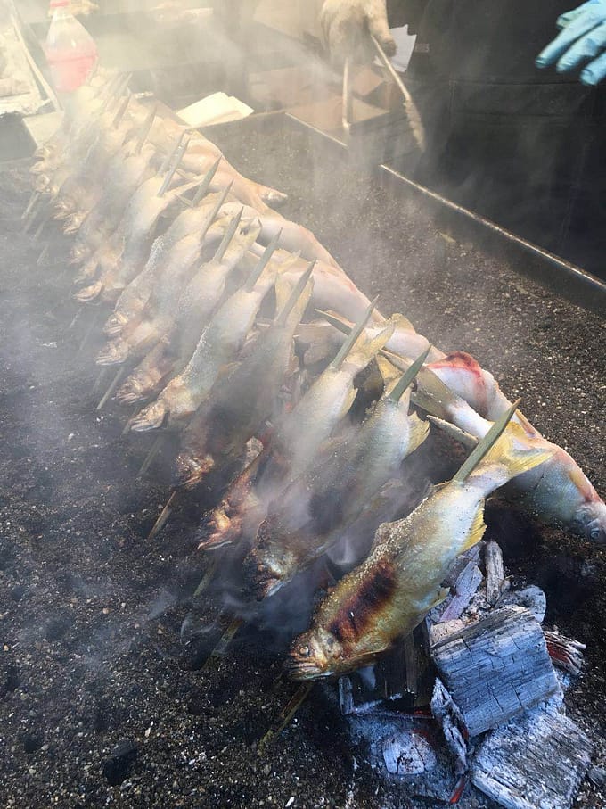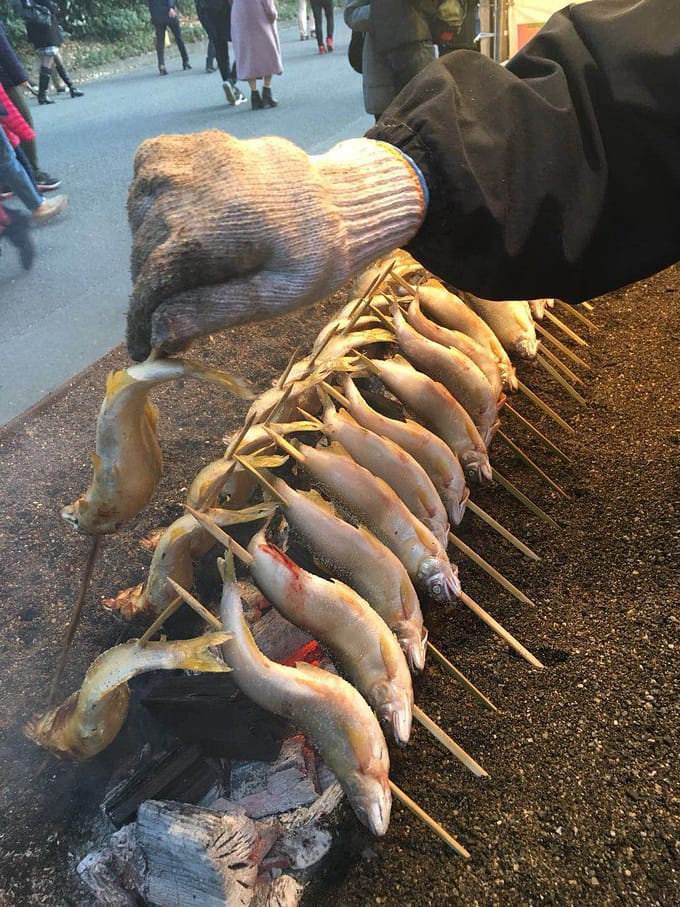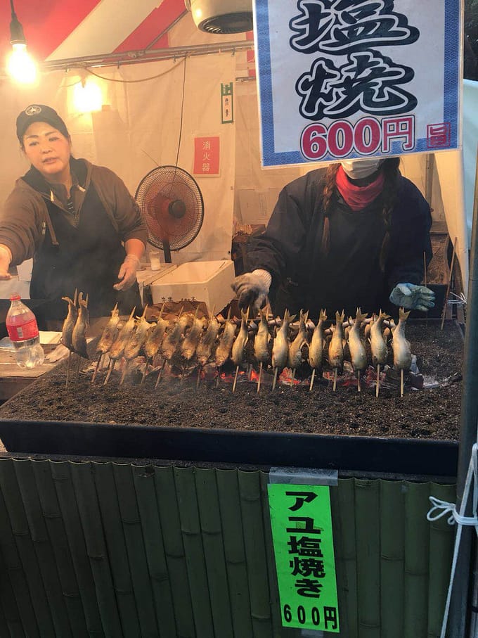 屋台で食べるアユの塩焼き