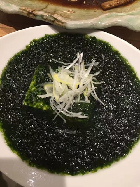 お豆腐にアオサがたっぷりかかっていて、その上にネギがちょこと。上品な磯の香がしてとても美味しかったです。