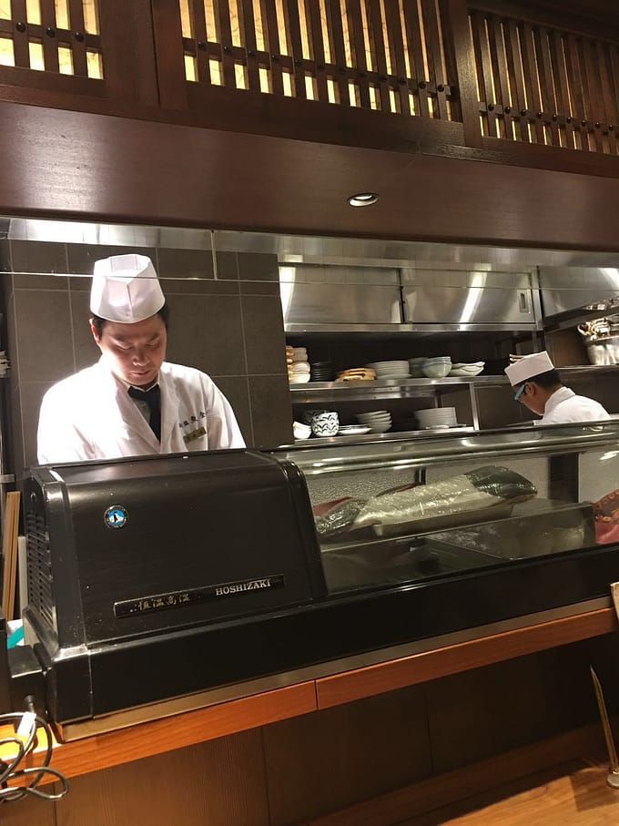 店内は落ち着いた雰囲気。厨房の中の板さん、白衣姿にネクタイがすてき。