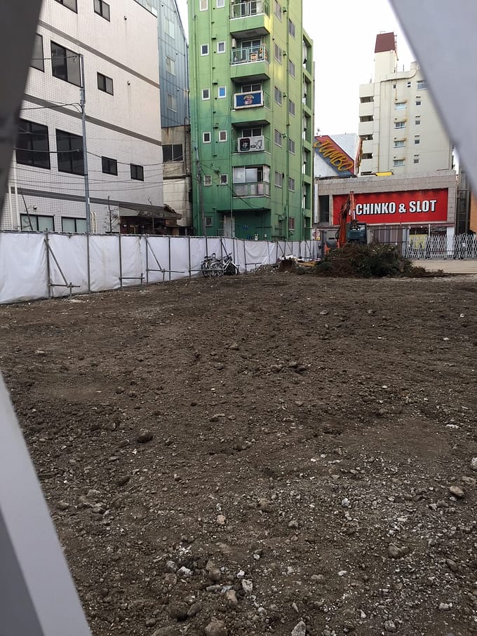 今はさら地ですが、パチンコ屋さんの大きな建物が建っていました。このさら地も、昔は平屋のお家や、お店屋さん、木造のアパートもあったのかなー