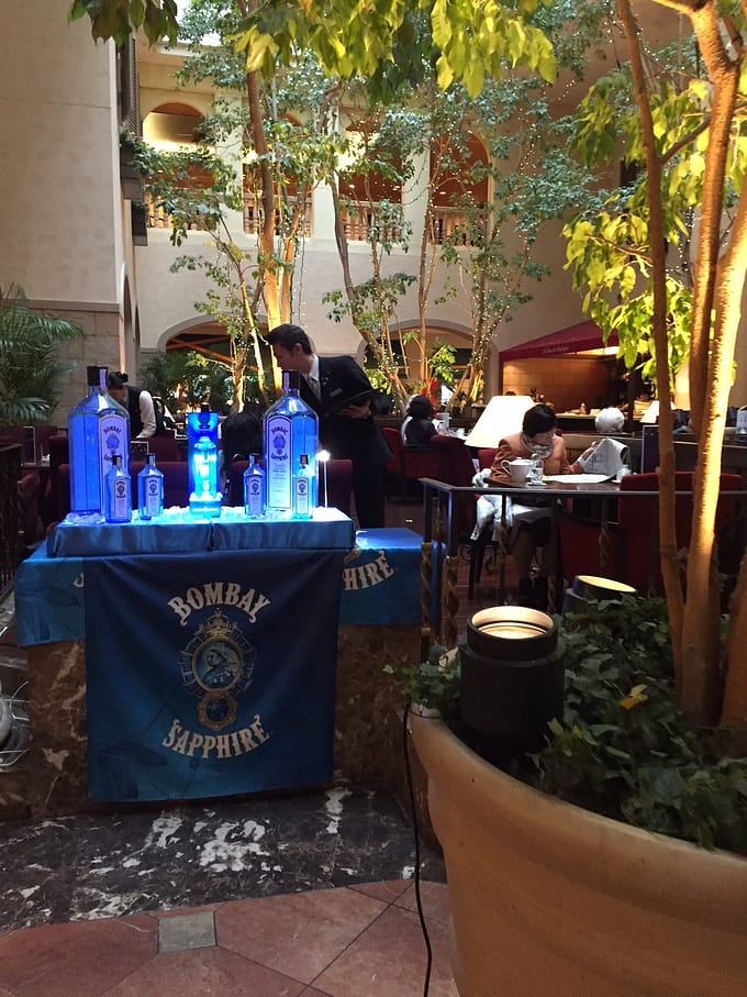 青いボトルはジン、ボンベイです。青い光がロマンチックね
