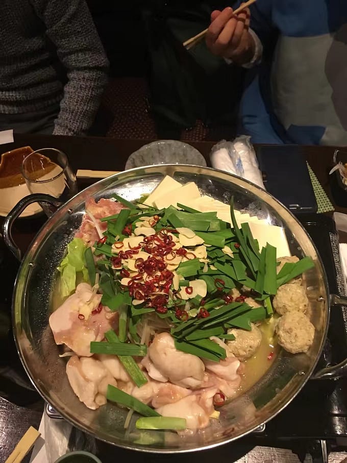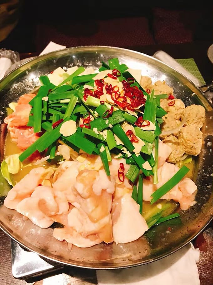 もつ鍋は、お肌すべすべになる効果があるんですよね。ニラの緑色と、唐辛子の赤い色がとっても鮮やかです。