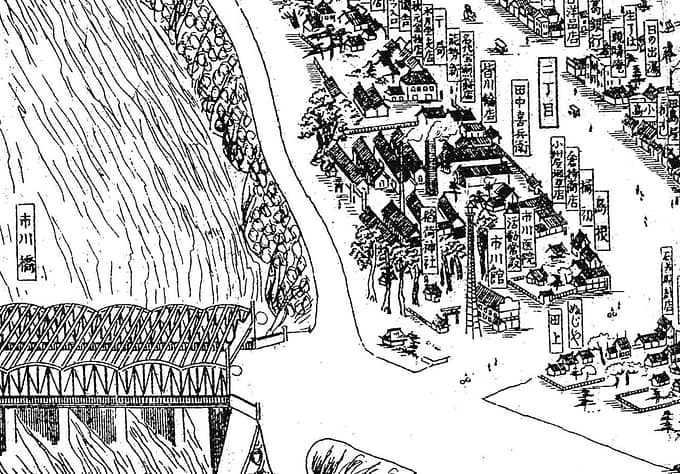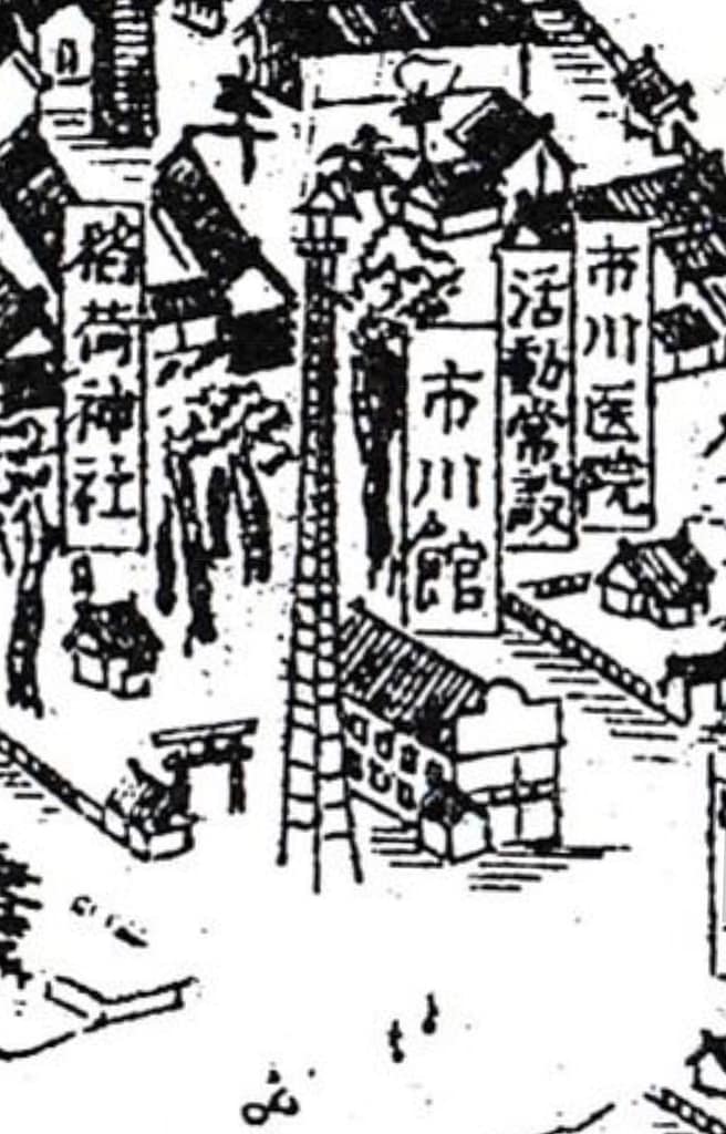 左の市川橋から右に視線を少し移すと、稲荷神社があります。日本の神社で一番多いのがお稲荷さんだそうです。