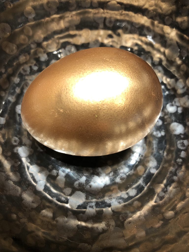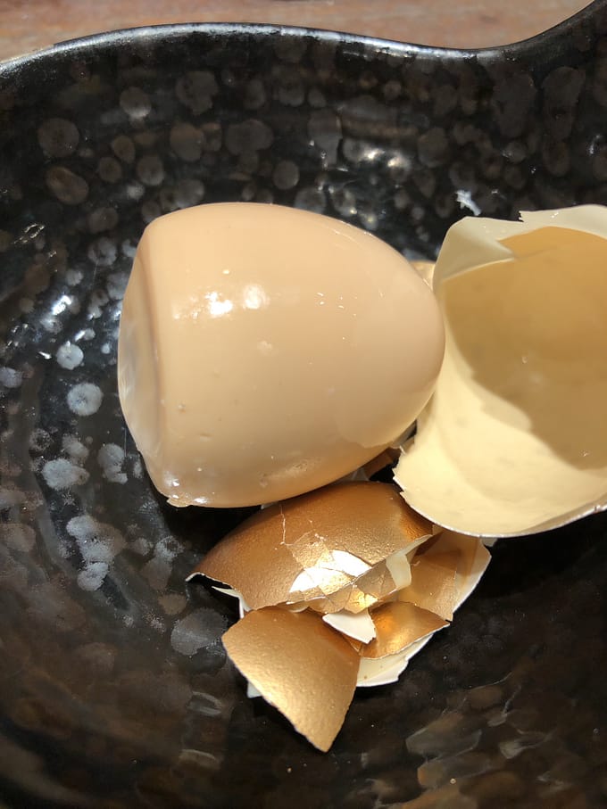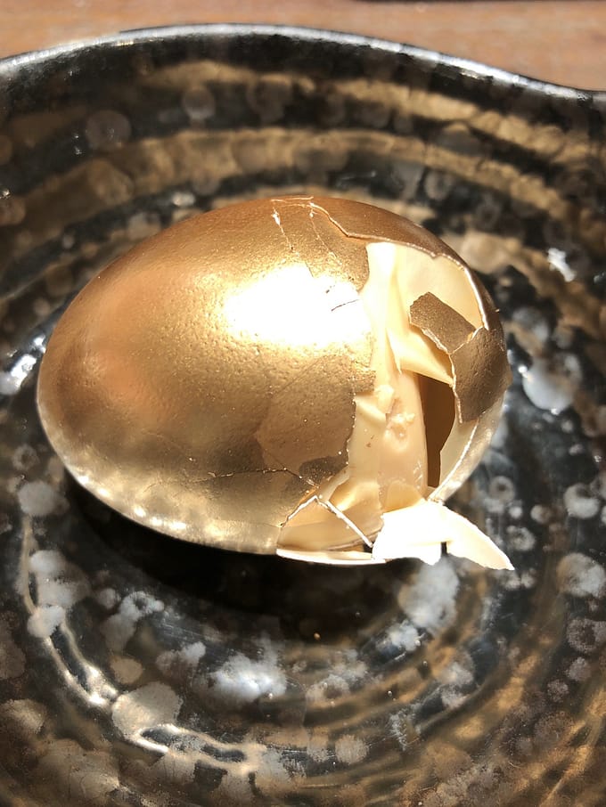 金の卵をじっとながめながら思ったことは、どうやって作ったんだろう?、白身や黄身も金色なのかな?味は?