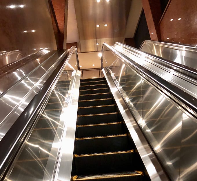 ピンピカのエスカレーターで地下のレストランへ(地下から撮ったエスカレーター)
