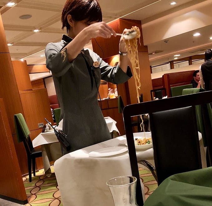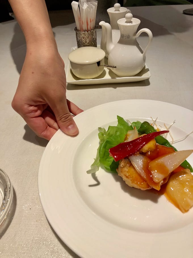 コース料理を一品一品、こうしてウエイトレスさんが小皿に分けてくれるんです。とっても優雅な気持ちになります。