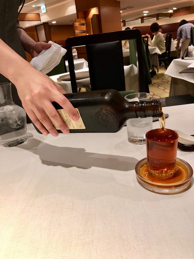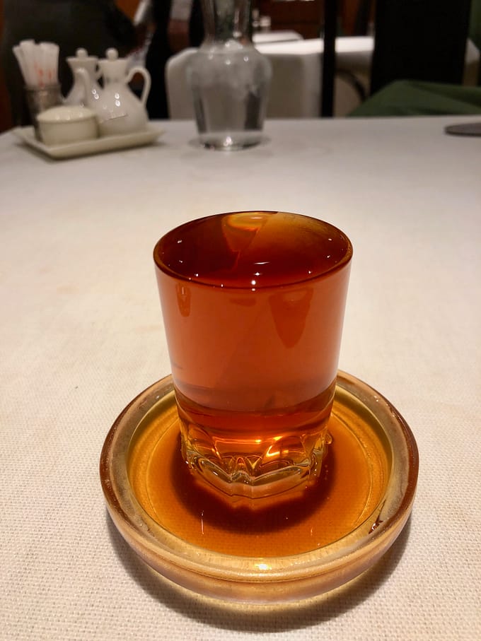 並々つがれた紹興酒。飲むときはグラスから飲む?それともお皿から飲む?普通はグラスからですねー