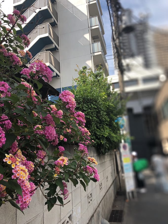 昔ながらのトタンの壁の前に、色鮮やかに咲いたお花。風情がありますねー