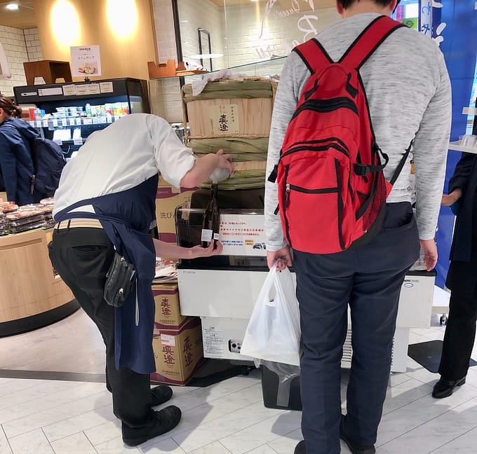 樽からこうしてお酒を瓶に入れているんです。他の人も試飲してから、じっと見物していました。