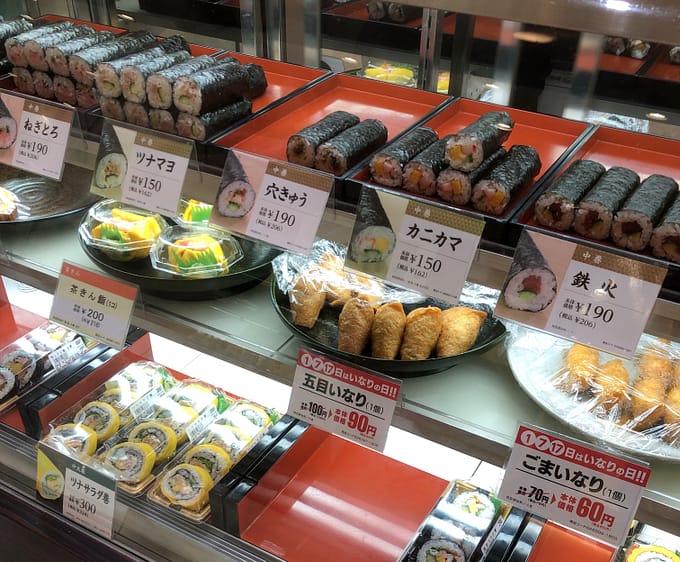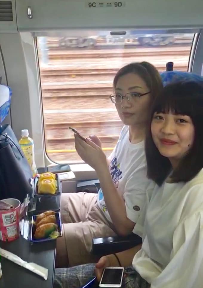 ちょっとした旅行気分。けいちゃんは茶きん鮨、李瑩(りえい)ちゃんは五目いなり。