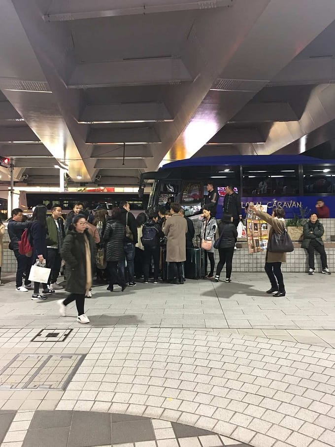 バスから降りてきたのは、中国からの観光の方々です。みなさん、かに道楽のお客様のようです。