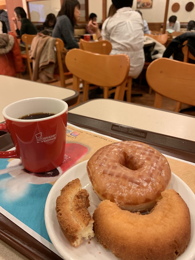 ミスドでコーヒーにドーナツ。疲れているときの甘いモノでホッと一息しています。