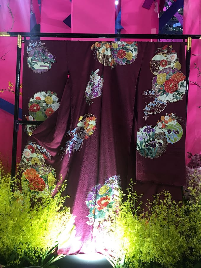 赤紫色の生地にお花、お花が浮かんで見えます。