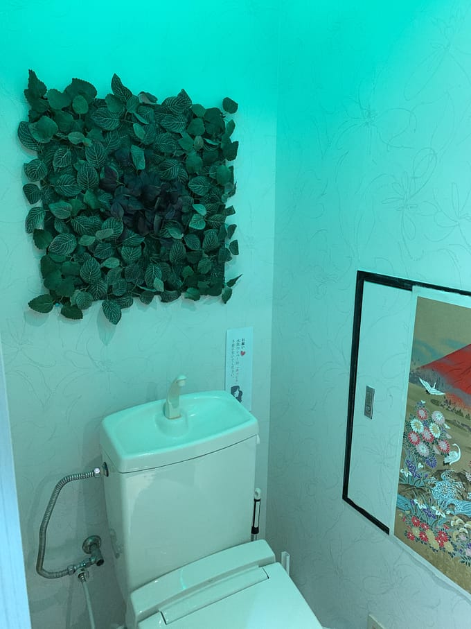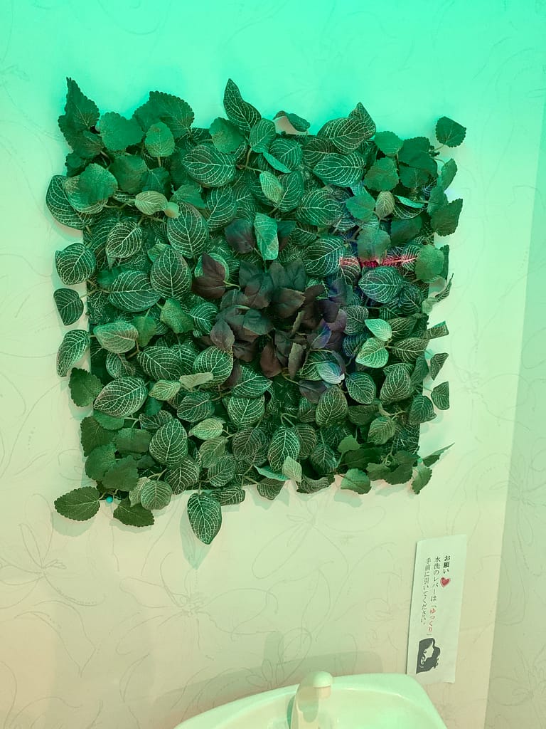 トイレの壁に、葉っぱの飾り物を画鋲で付けてみたよ。葉っぱを見ながら、癒されるかな?でも、葉っぱにかけないでよ!絶対に。笑