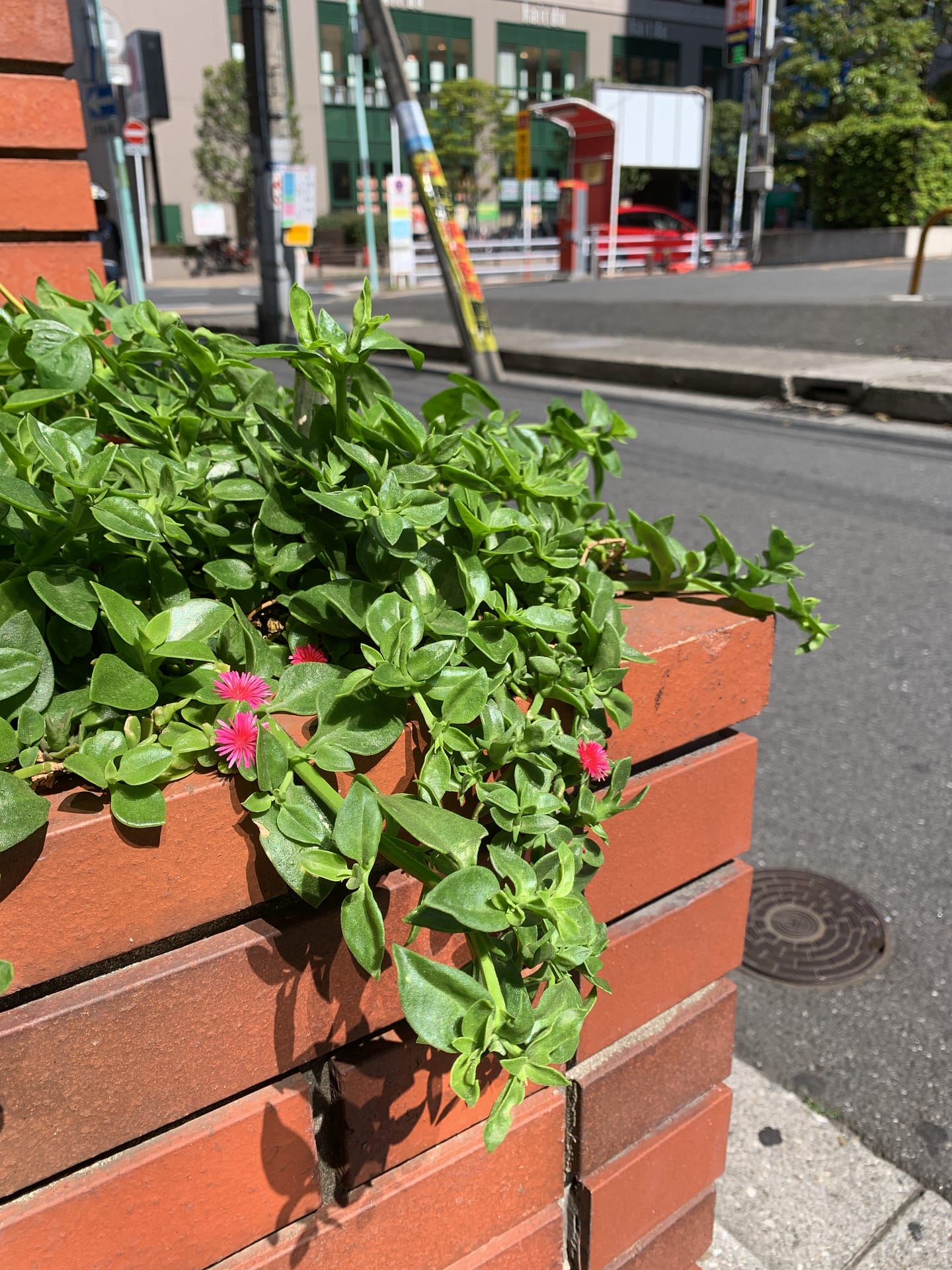 名前はわかりませんが二種類のお花が咲いています。レンガと緑色の葉ぱが、お日様を浴びてキレイですねー