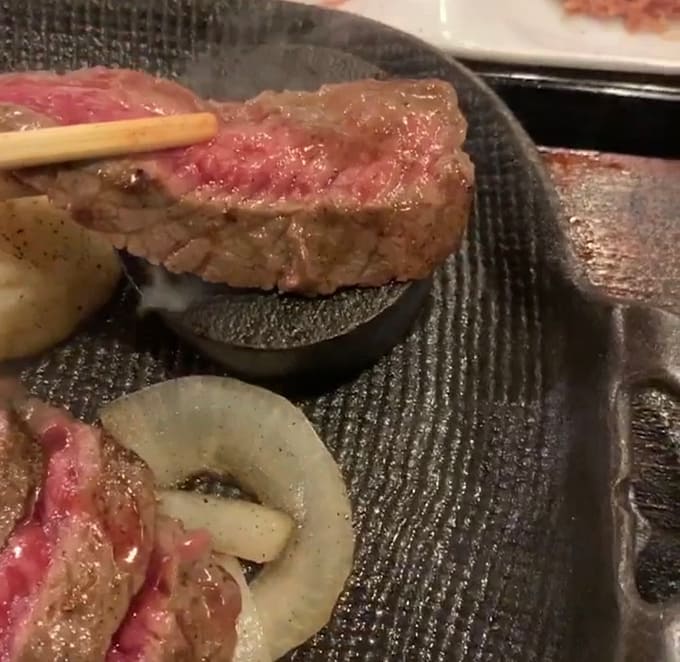 鉄板より熱いペレットの上でレアのお肉を焼きます。