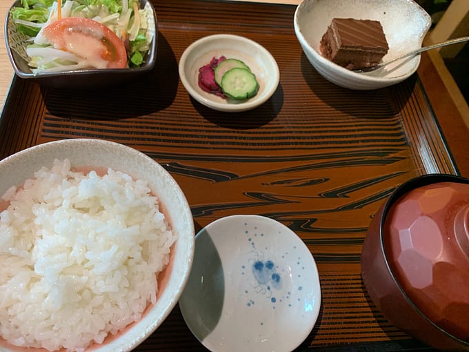基本のご飯、お味噌汁、漬物、サラダ、デザート