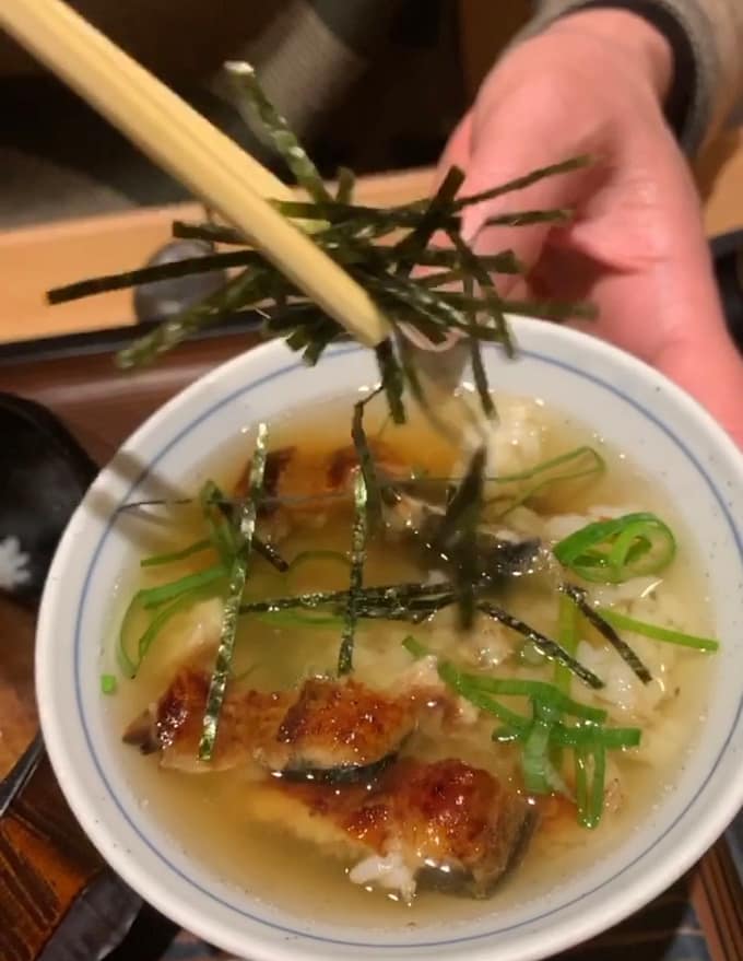 わさび、ねぎを入れたら、だし汁を注ぎます。