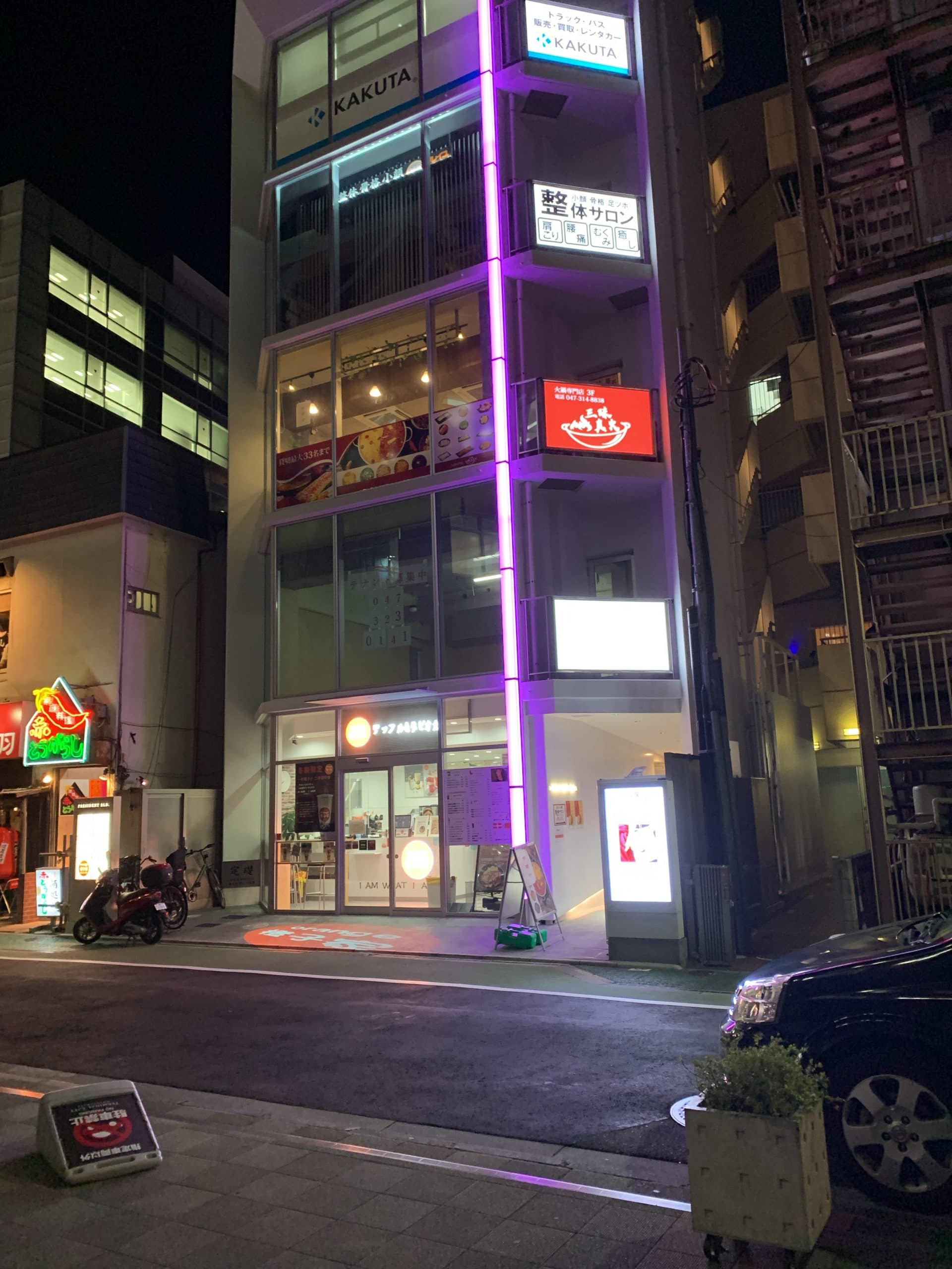 真っ直ぐ歩いて三分位のところ、左側に新しいビルがあります。