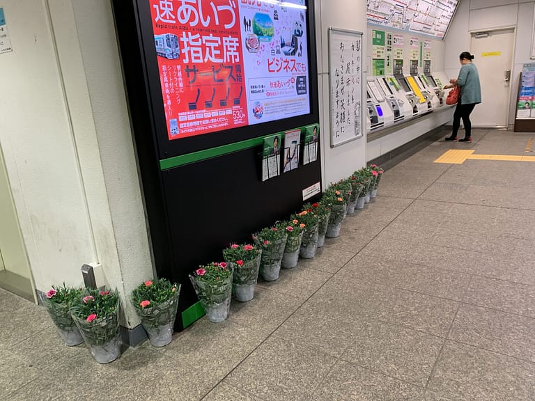 「駅の中にカーネーションを展示しました。みなさまが笑顔になりますように」