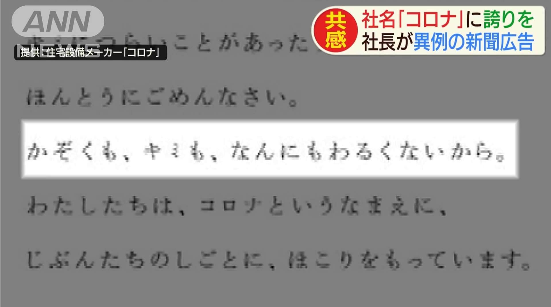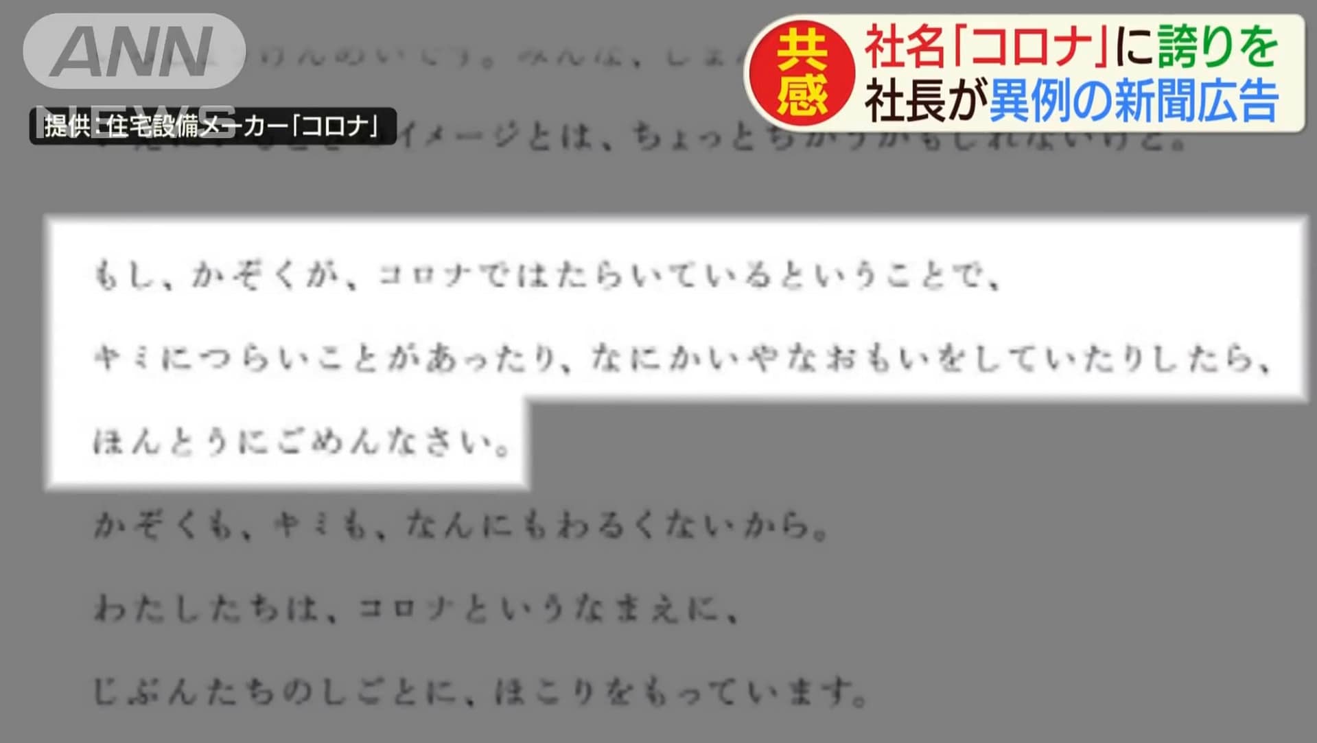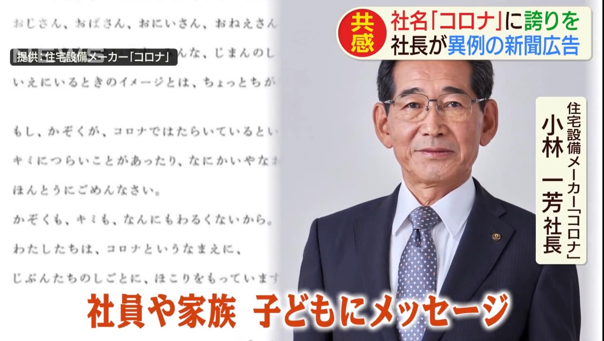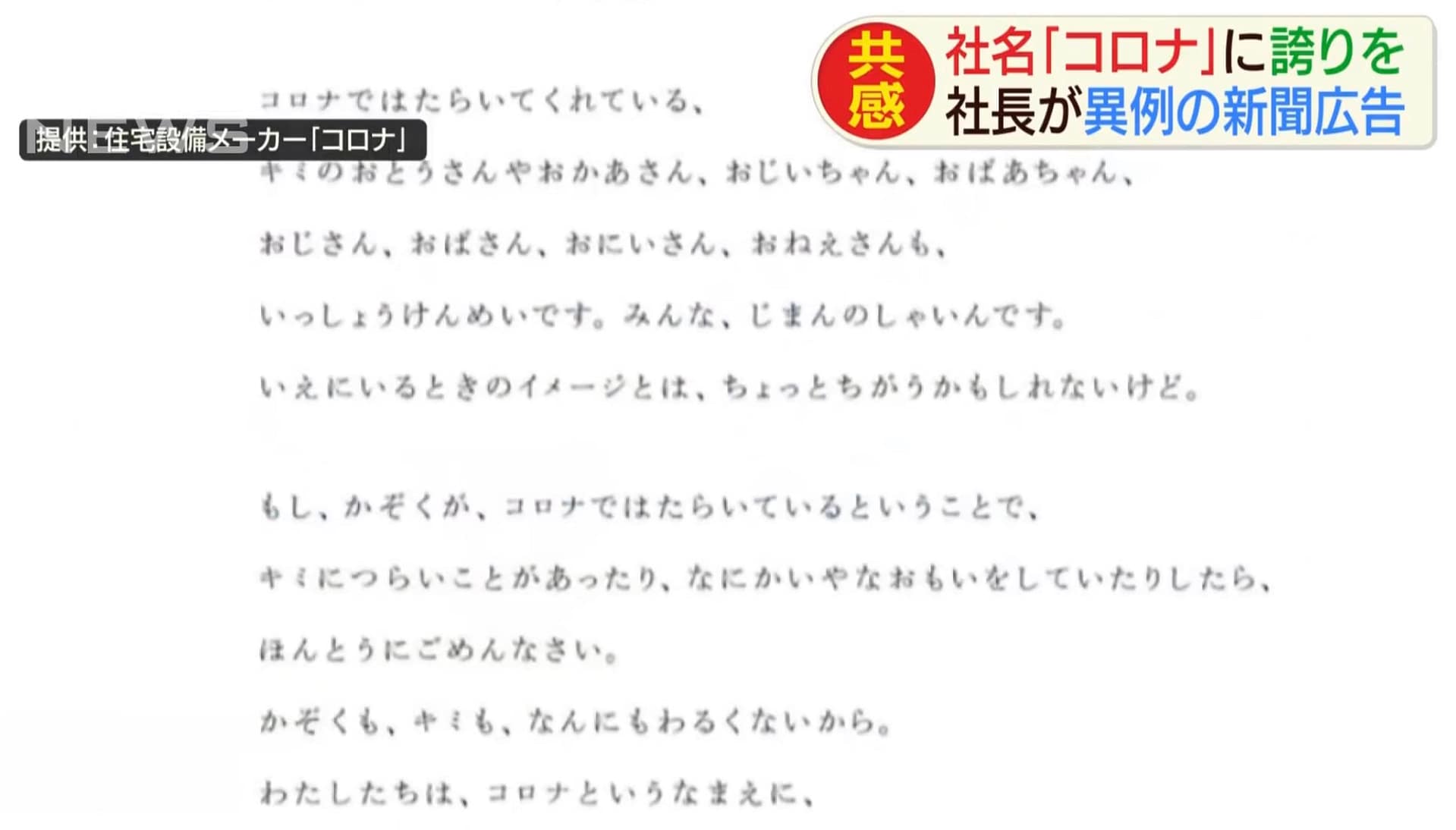 会社名が株式会社コロナの社長さんの言葉が心に染みました。