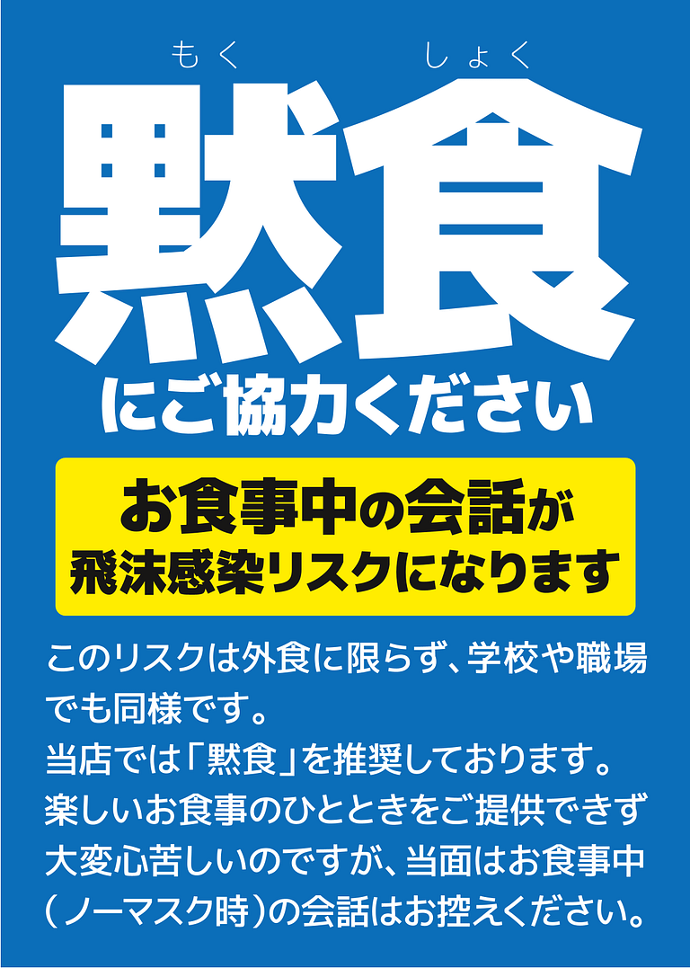 黙食(もくしょく)の意味は「だまって食べる」こと。飲食店では黙食をお願いしているお店も増えているようです。