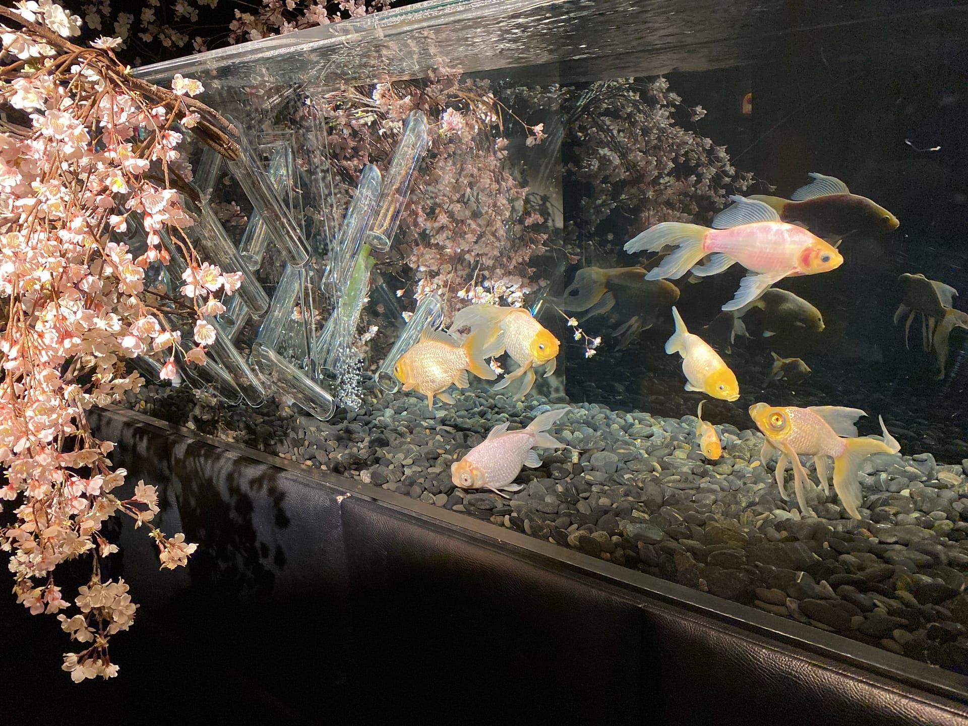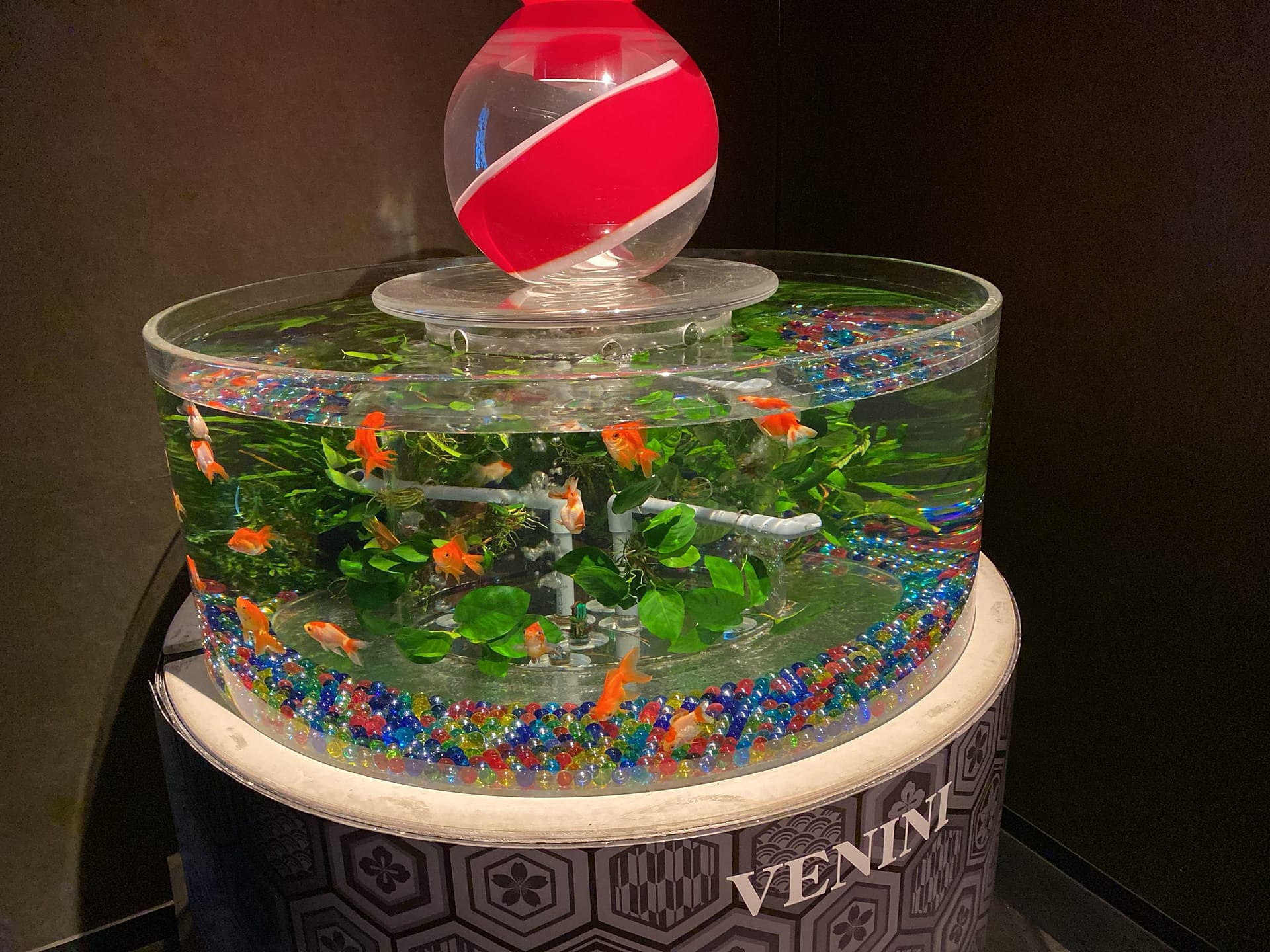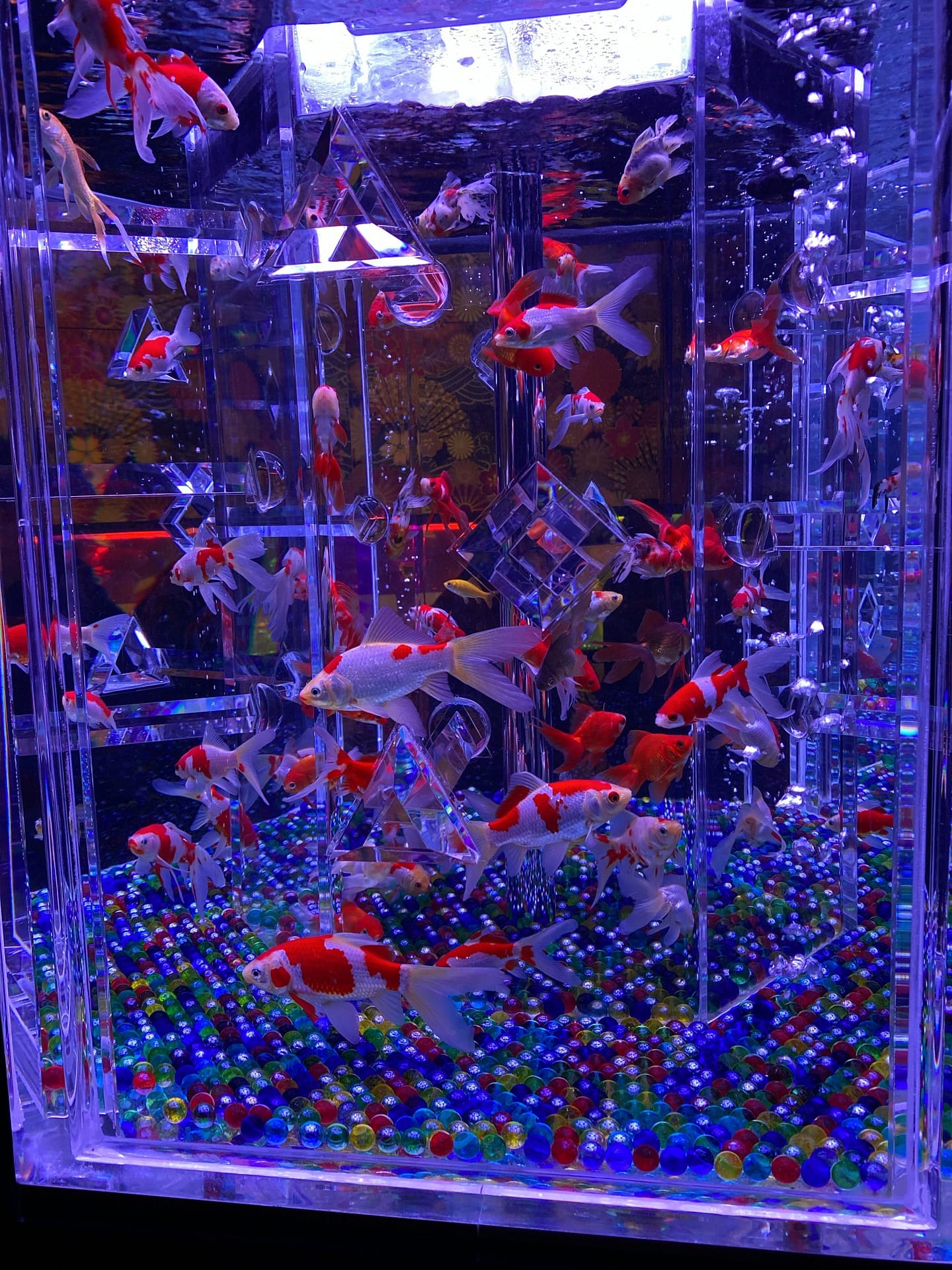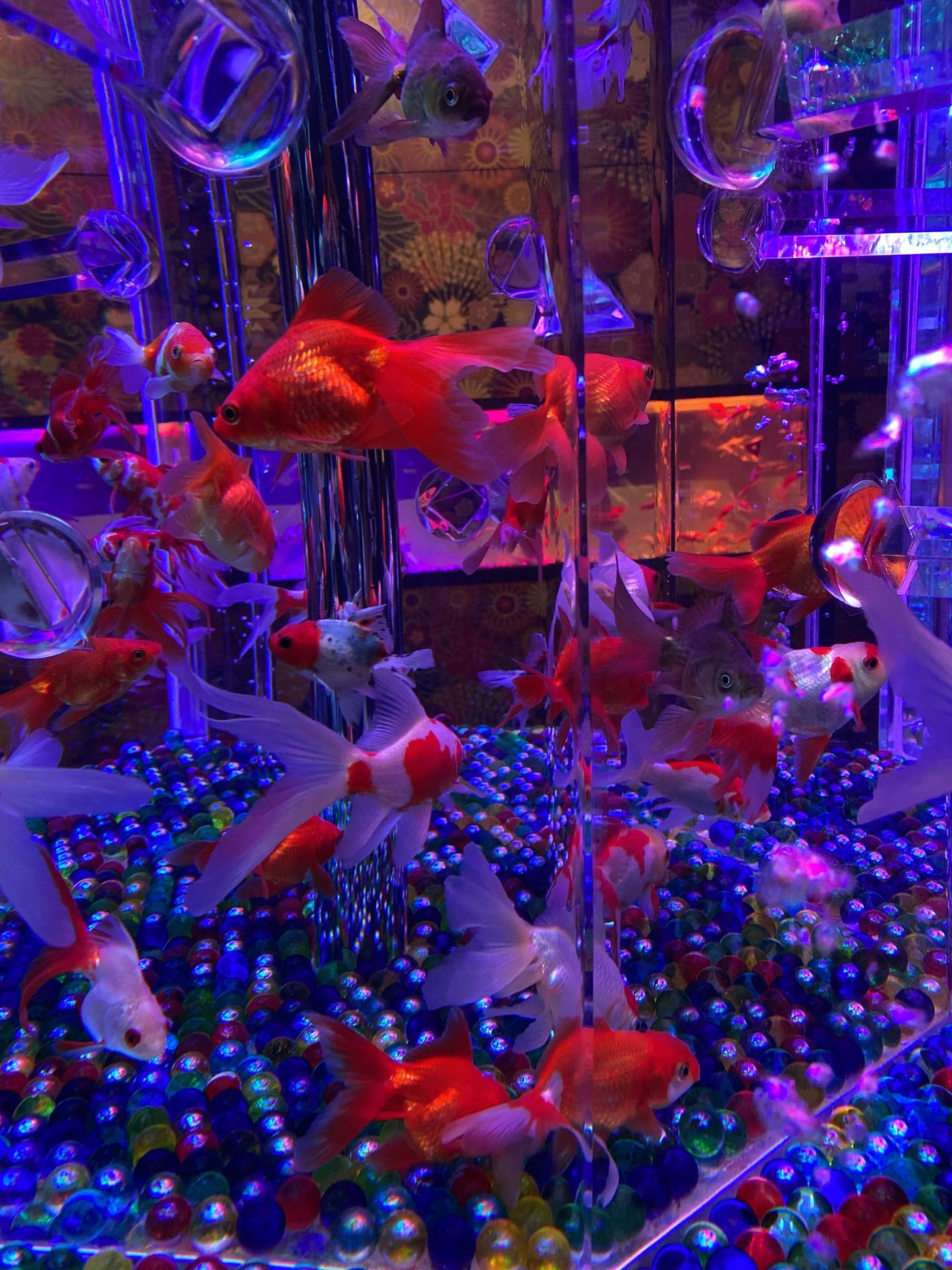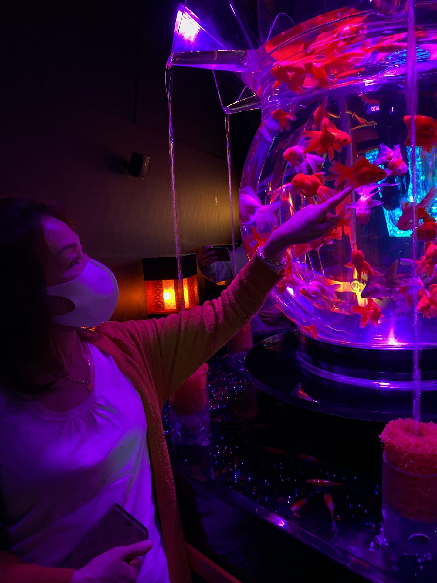 写真撮影は許可されているので、みなさんポーズをとりながら金魚と一緒に撮影しています。