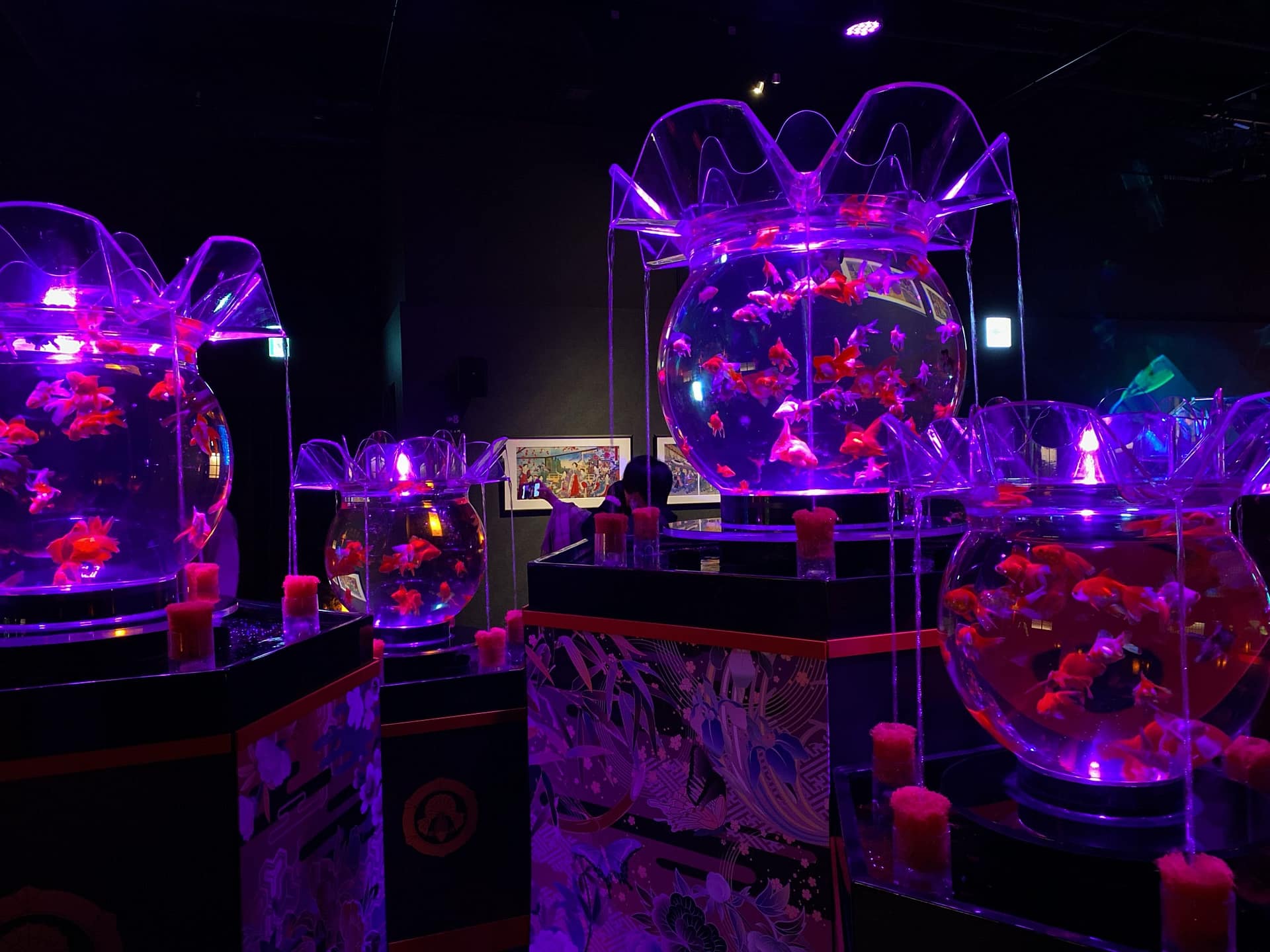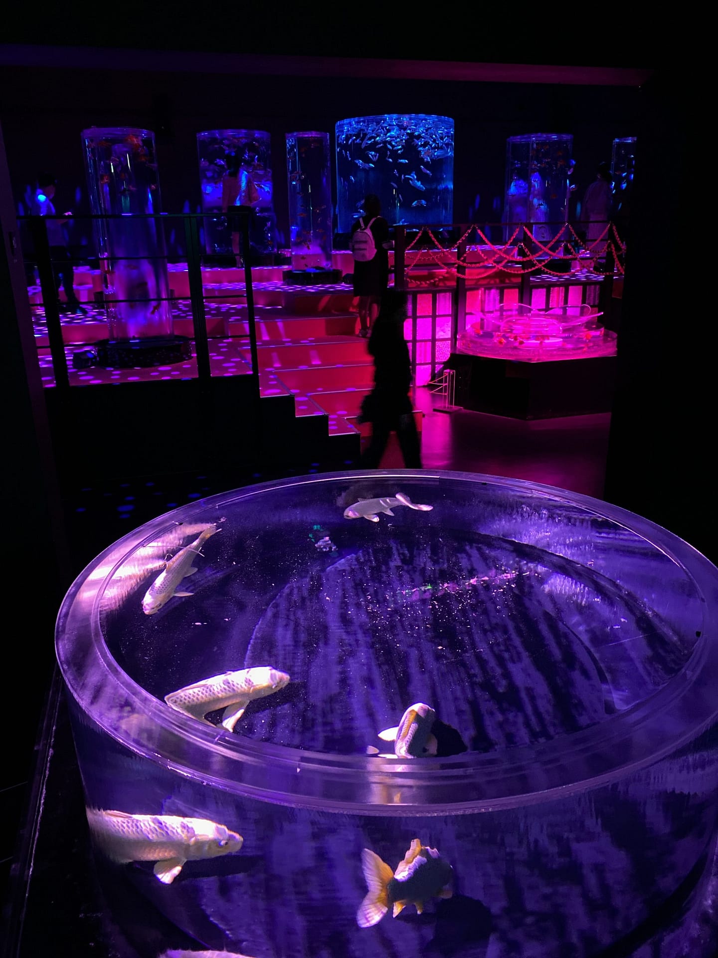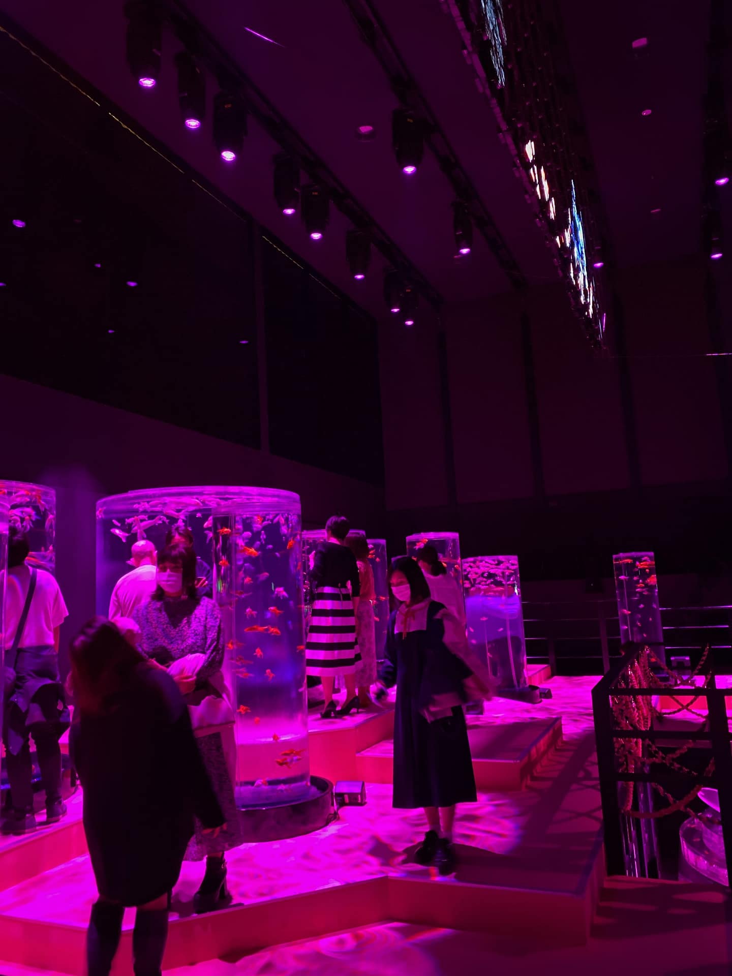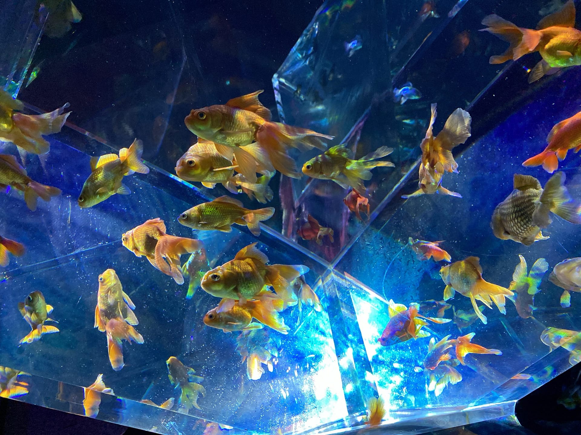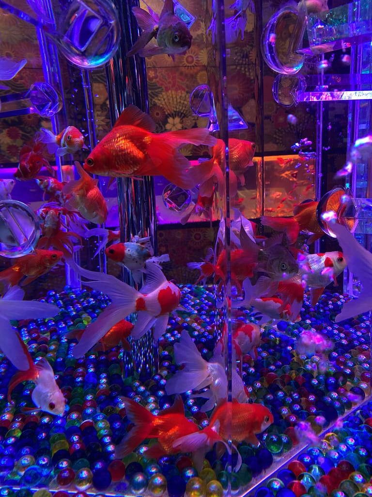 写真撮影は許可されているので、みなさんポーズをとりながら金魚と一緒に撮影しています。