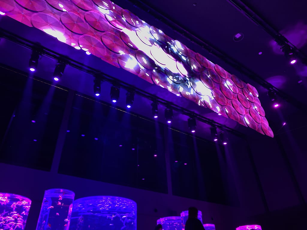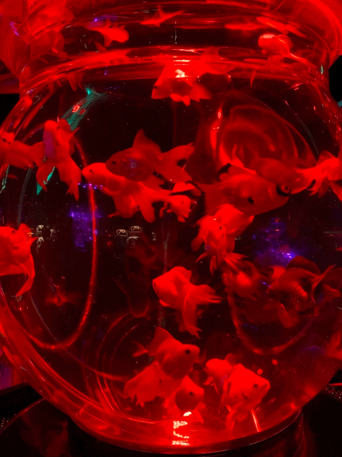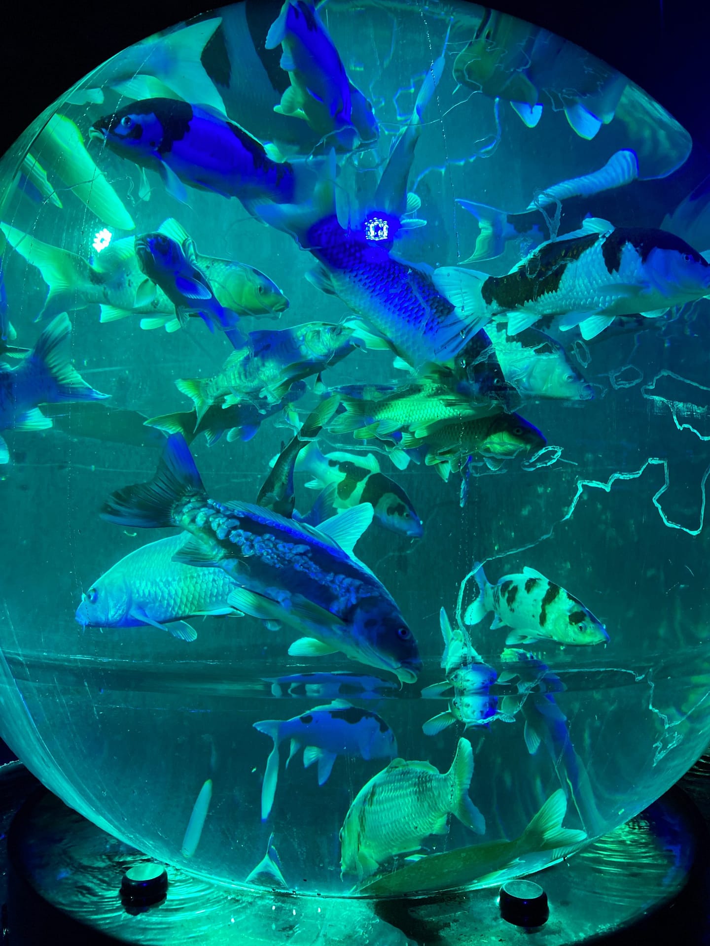 スポットライトを浴びた金魚が、優雅に泳いでいます。
