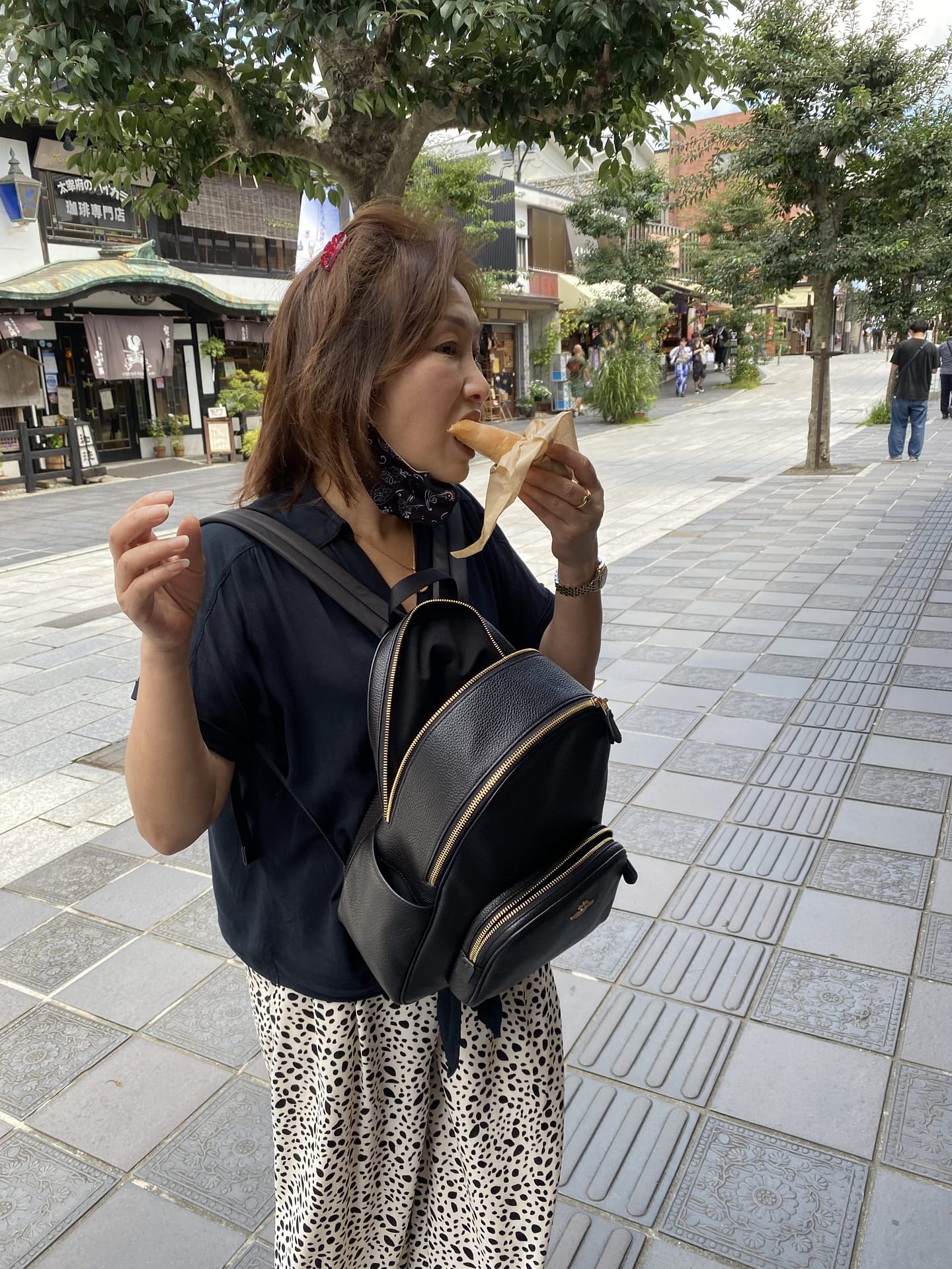 私が食べているのは明太子をはさんだフランスパン、サクッとした食感と明太子で美味しかったです。