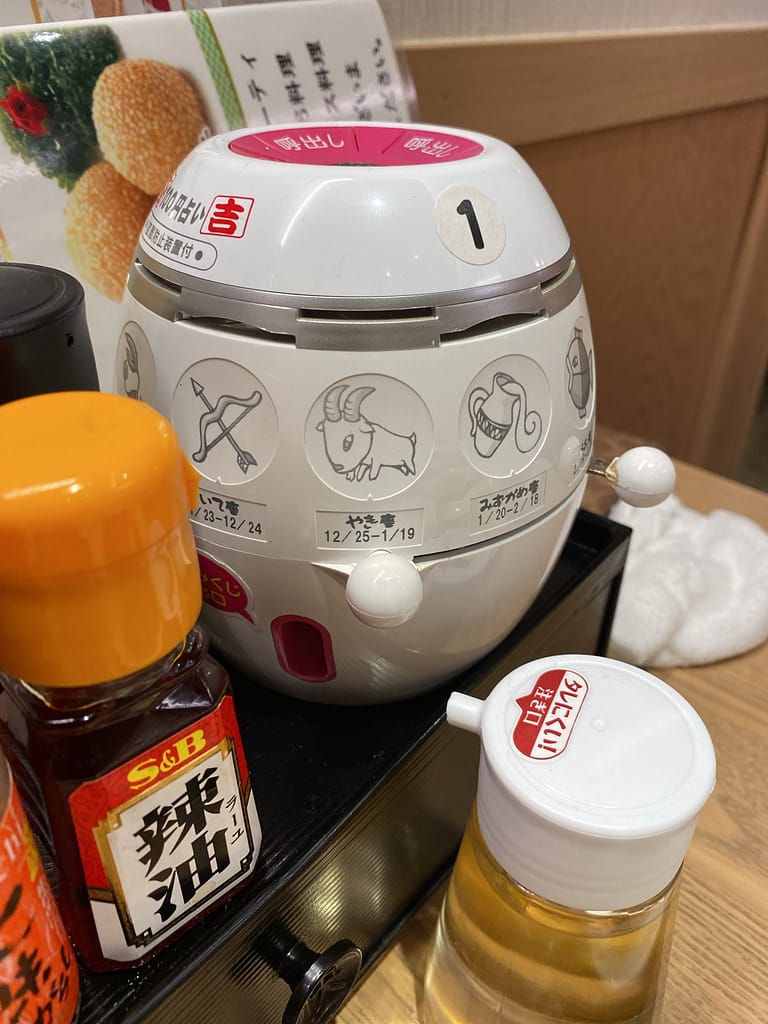 ピンクのボタンは、呼出し、ご注文、お会計、めずらしい100円の占い械
