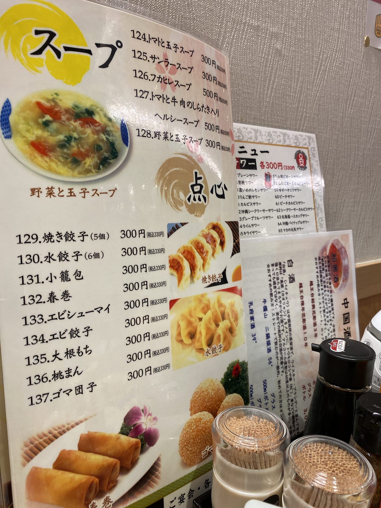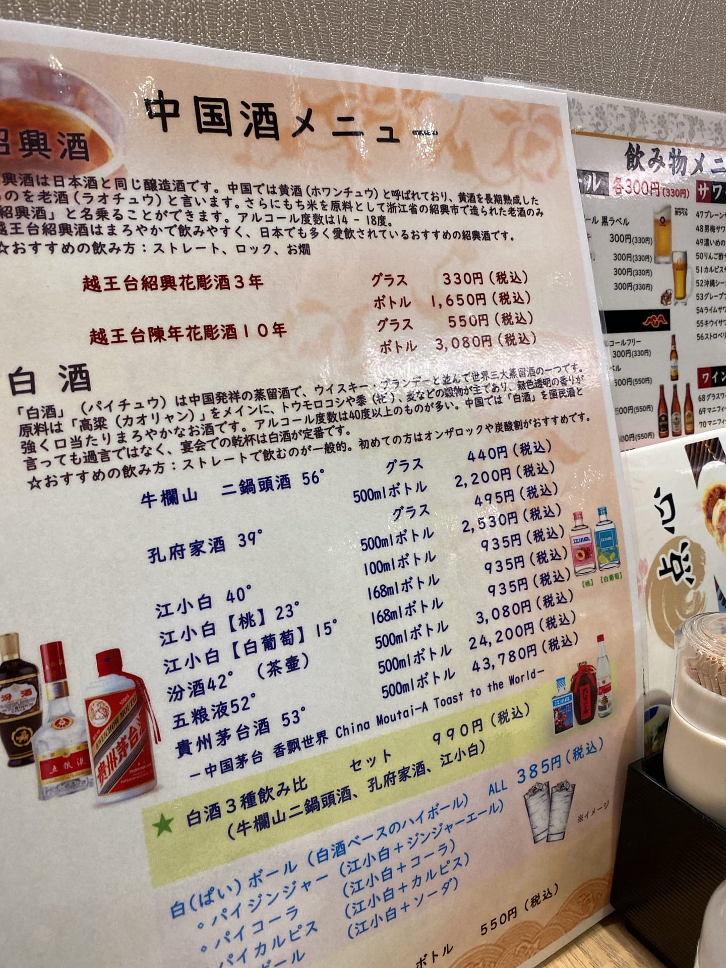 中国のお酒も種類が多いです。お料理も本格的、熱々で美味しかったです。きっと料理人は中国の方かな?